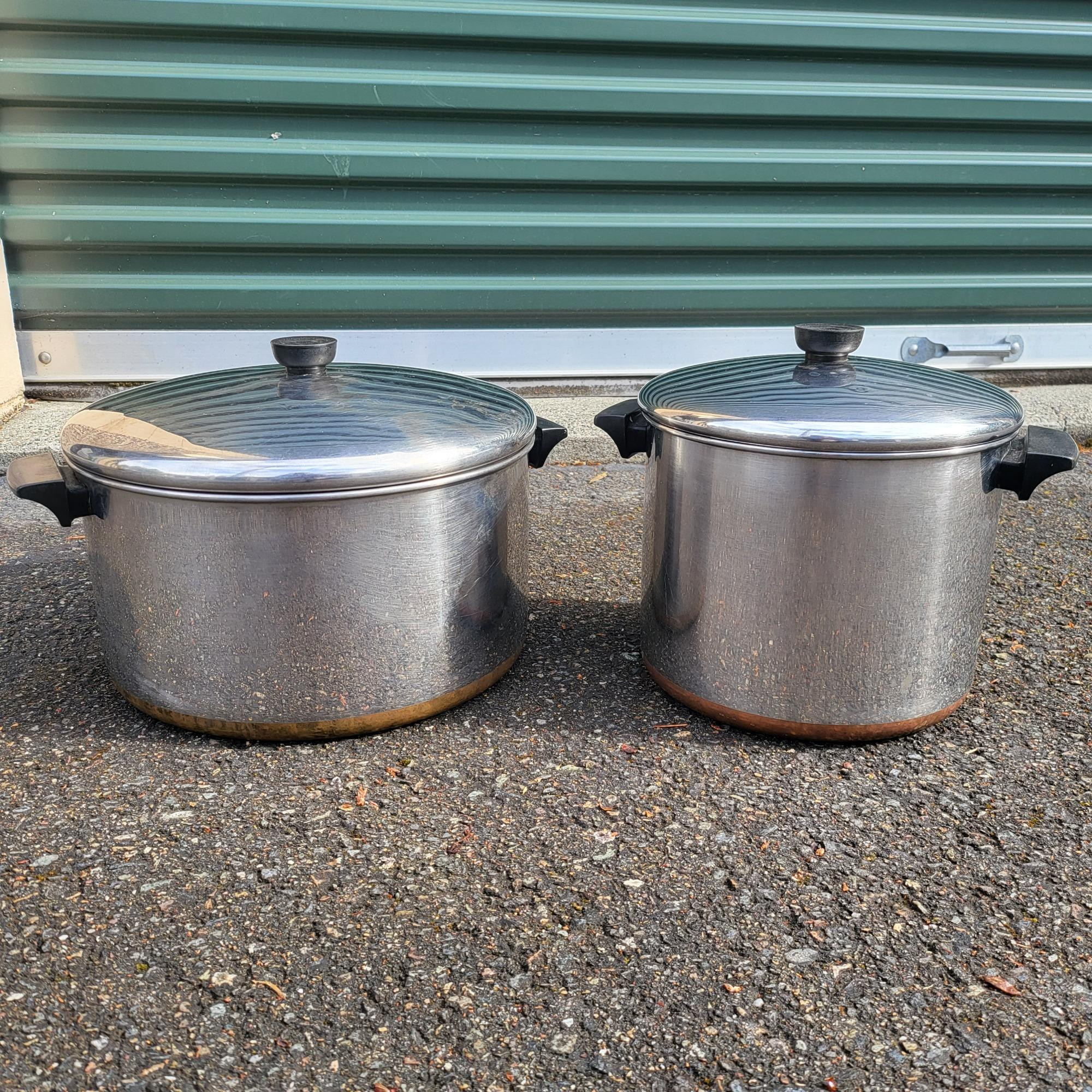 8qt and 12qt Revere Ware USA stock pots with lids.
