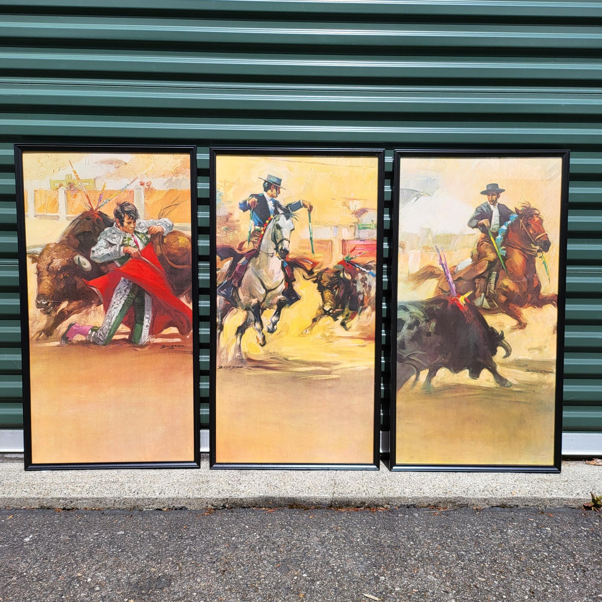 Three vintage, Spanish Matador bull fighting scene framed wall hanger prints. Each one is 20" long x 37" tall. They are signed Ballestar. Professionally framed by Frameworks, Alaska.