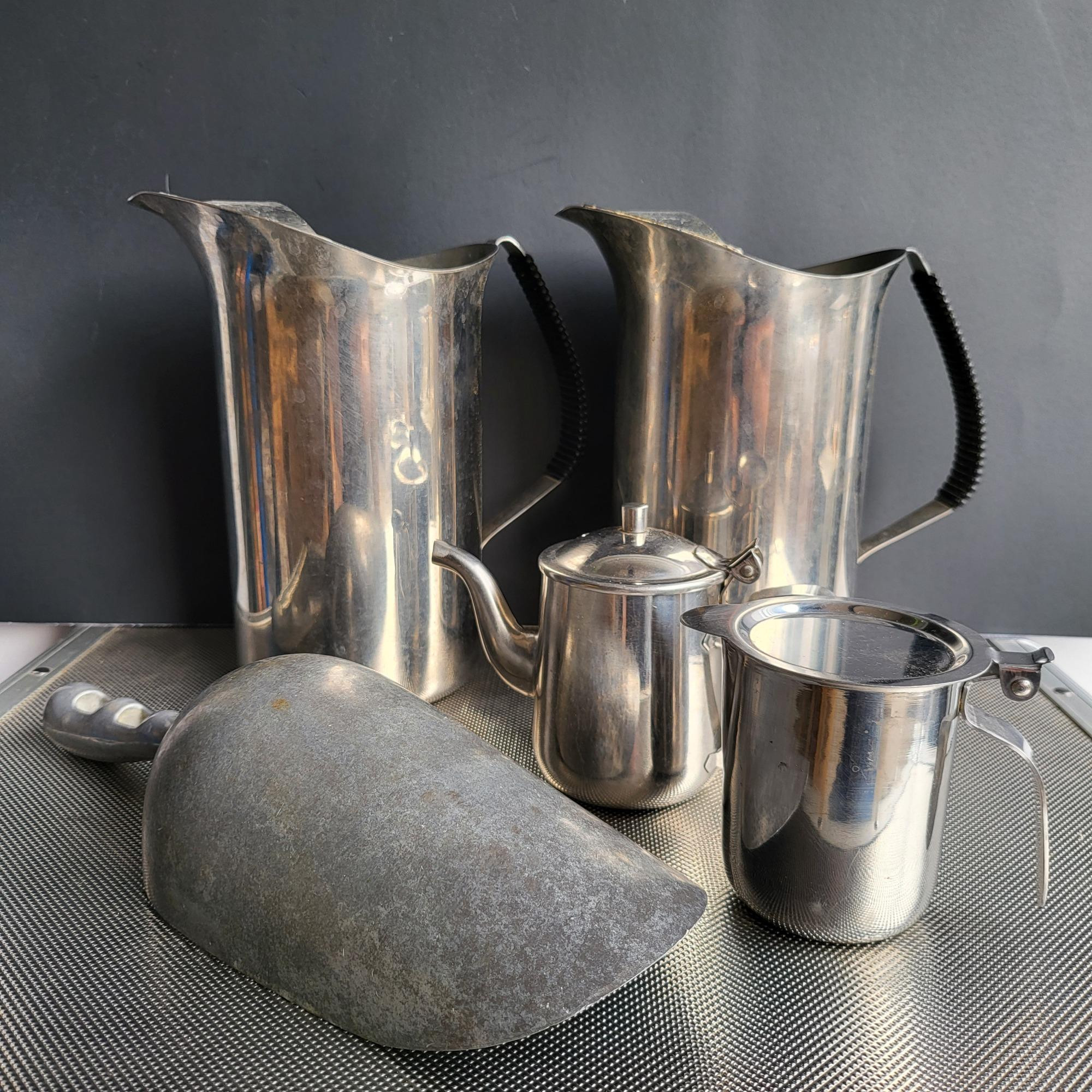 (2) Stainless steel ice water pitchers (1) 8.25" heavy glass pitcher Yukon Jack (3) 8" clear glass beer putchers (3) Empty vintage green jugs, 12" tall Aluminum ice scoop and two stainless steel lidded creamers