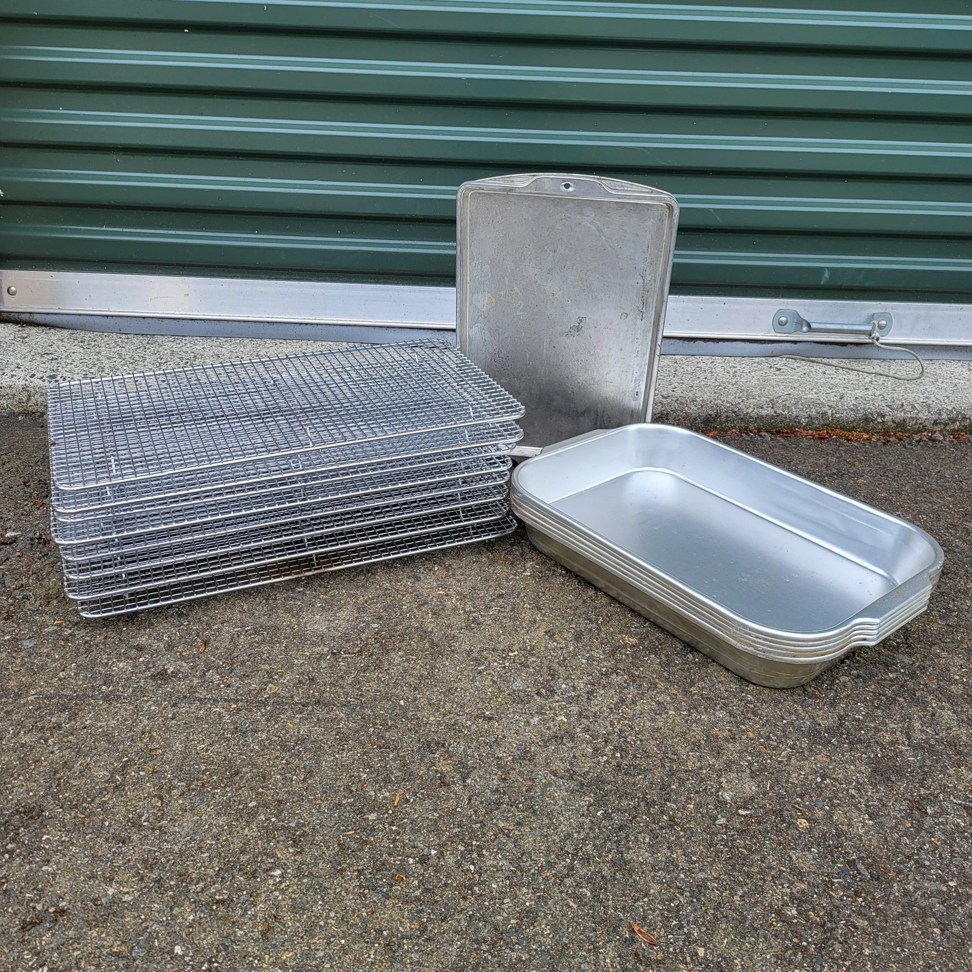 (3) 10" x 13" cookie sheets (8) 18" x 10" bakers cooling racks (5) 15.5" x 10.5" x 2.25" Wearever cake/casserole pans
