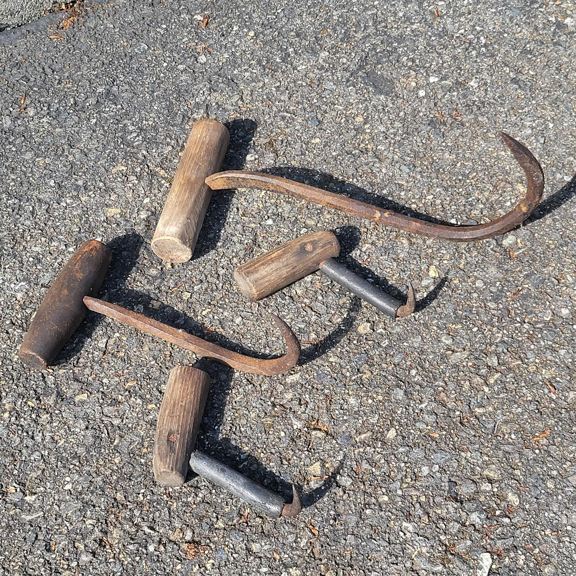 Antique wooden handle hay bale or meat hooks. 11", 7.5" 3.75" (2) ELIGIBLE FOR SHIPPING