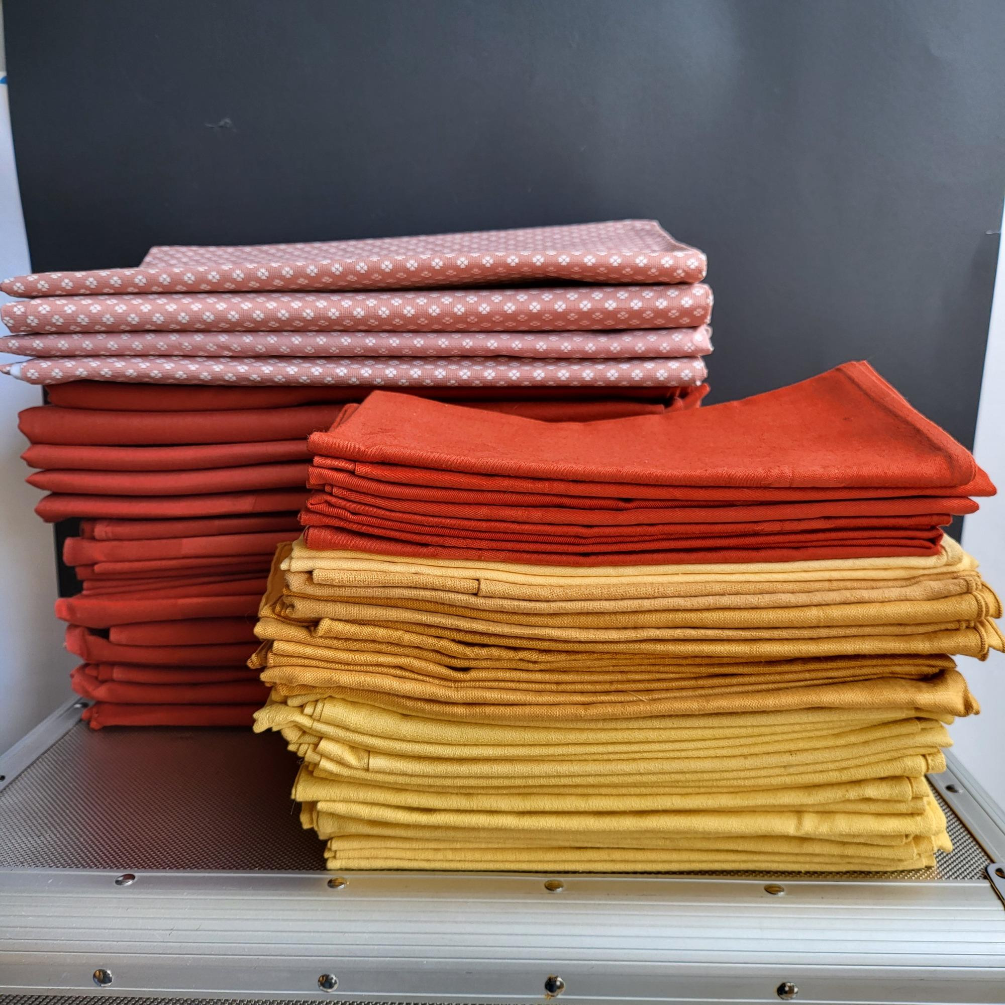 (16) No iron poly-cotton rust colored 54" x 54" tablecloths and (40) marigold & rust colored linen napkins 20" squared. Included are (4) wipeable felt back 54" x 54" (light vinyl coating) tablecloths.
