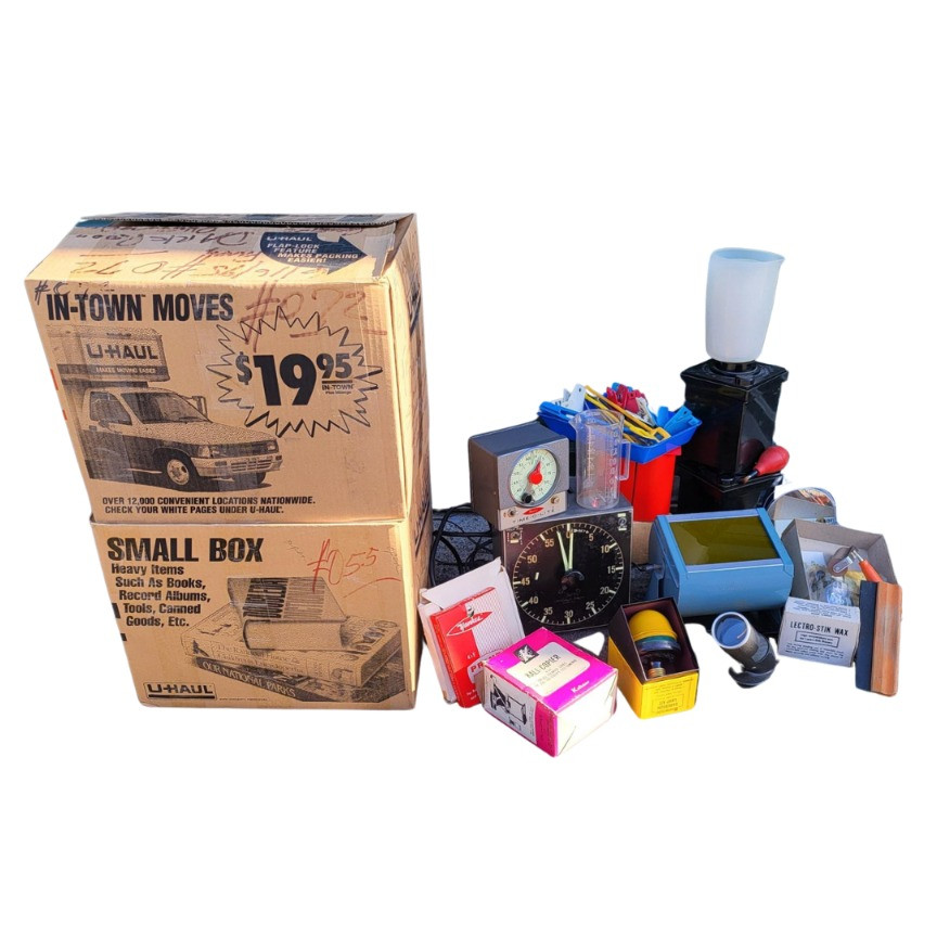 Vintage film developing supplies including two mystery boxes full of miscellaneous development and photography related supplies.