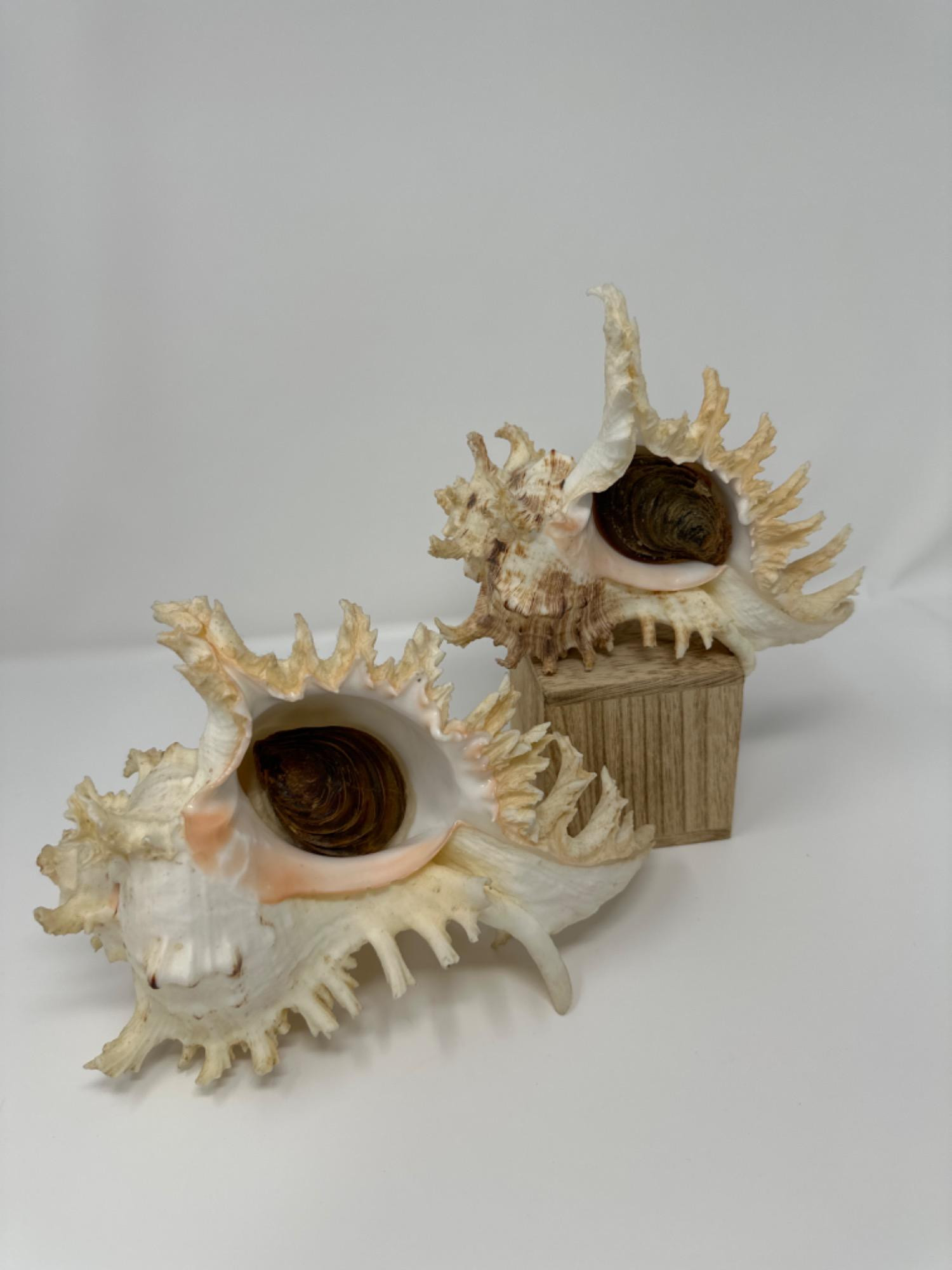 Two Ramose Murex Shells, live caught from the ocean in Okinawa Japan. 9” and 7” The Lace Murex, Chicoreus ramosus, is a striking marine gastropod known for its elaborate shell with long spines and variegated patterns. This species is a popular choice among shell collectors and reef aquarium enthusiasts for its ornate appearance. The shell's coloration can range from white to pink or purple, often with brown bands.