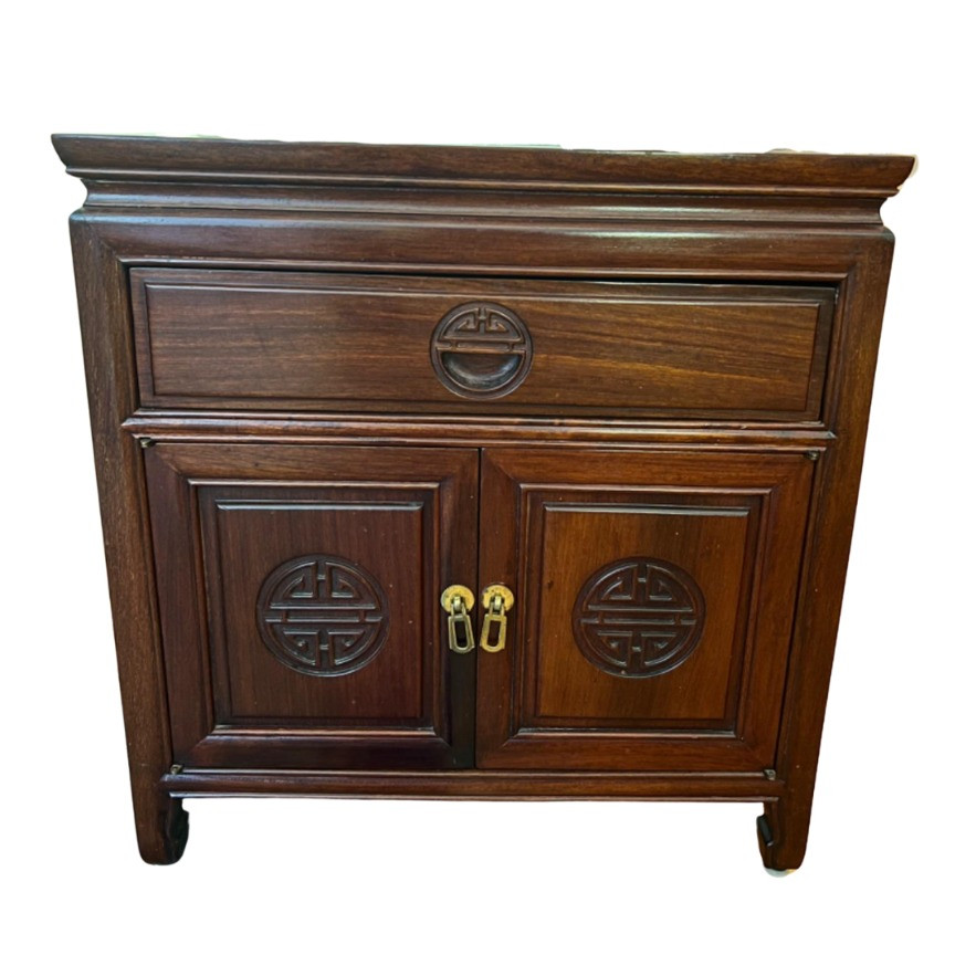 Asian solid rosewood end table by the Far Eastern Furnishing Company, Hong Kong. One top drawer and bottom cabinet with hinged doors. Mid 20th century. In excellent condition for its age and use. Measures: 22" x 22" x 23" tall. Bidding on this lot is an agreement that: (1.) You