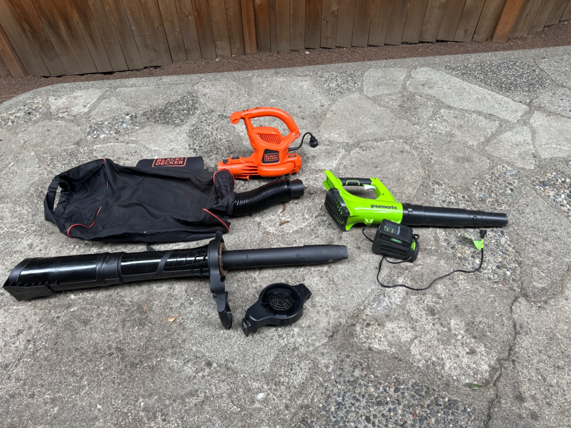 Black & Decker leaf blower with attachments and bag, electric. Green works leaf blower battery operated has the battery charger,no attachments found.