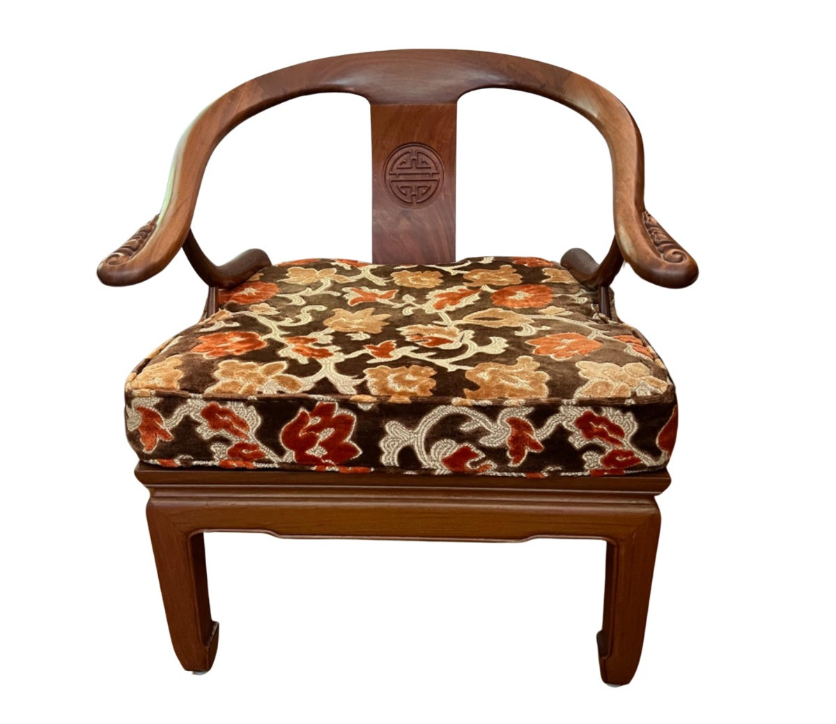 Mid century Asian horseshoe chair made of solid rosewood. Has floral warm tones cushion cover and two more cushion covers (vintage yellow floral & traditional neutral) see pictures. In excellent condition. Measures: 26" wide x 24" deep (seat) and 30" tall at back.