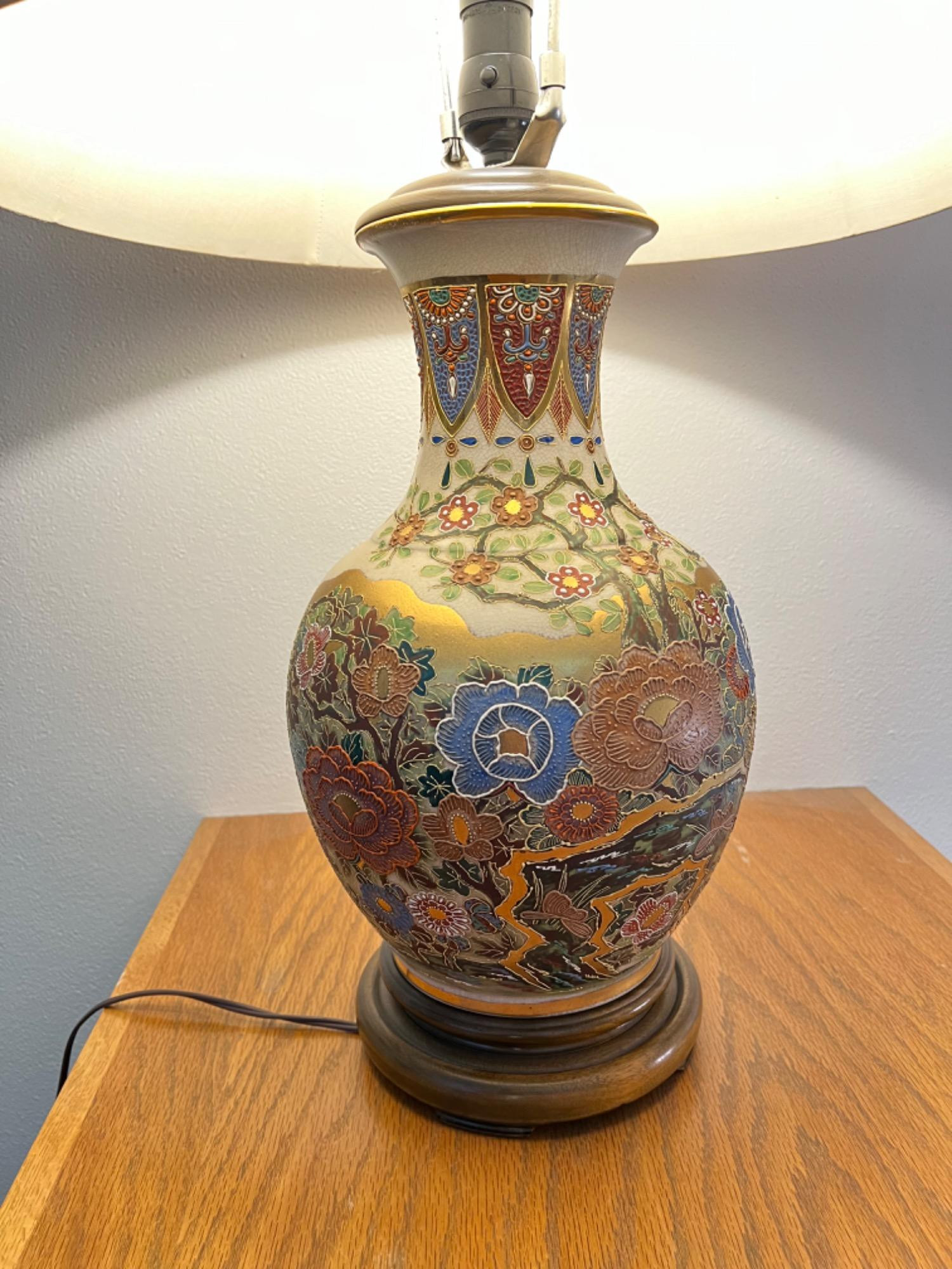 Far Eastern Furnishings beaded peony design Kutani lamp. Overall Lamp: 34.25" Height x 9" diameter - Shade: 11.25" long