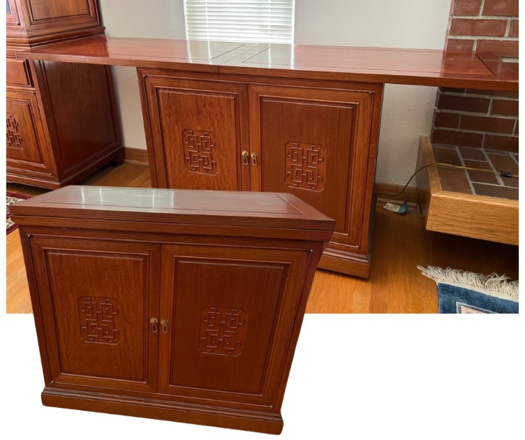 Solid rosewood with carved design on front and back. Buffet top has center hinge. One side folds over the other and top slides to reduce tabletop to a single cabinet. Two drawers, wine rack and two shelves. Far Eastern Furnishings Company, Hong Kong. Size: 36" width (52" width when buffet top is fully extended), 19" depth, 32" height Bidding on this lot is an agreement that: (1.) You