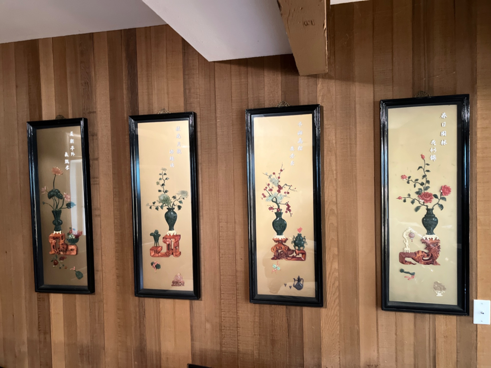 Four 3-dimensional panels encased with glass fronts. They have a shadow box effect. Each panel features a particular flower blooming from a carved pedestal & vase, along with an array of carved jade, amethyst, quartz & other semi-precious stone carvings. Text states each season of the year - spring, summer, fall and winter. Each artistic presentation is 15” x 40” x 1.5”. Rare, hard to find, art creations from the early 1900's.