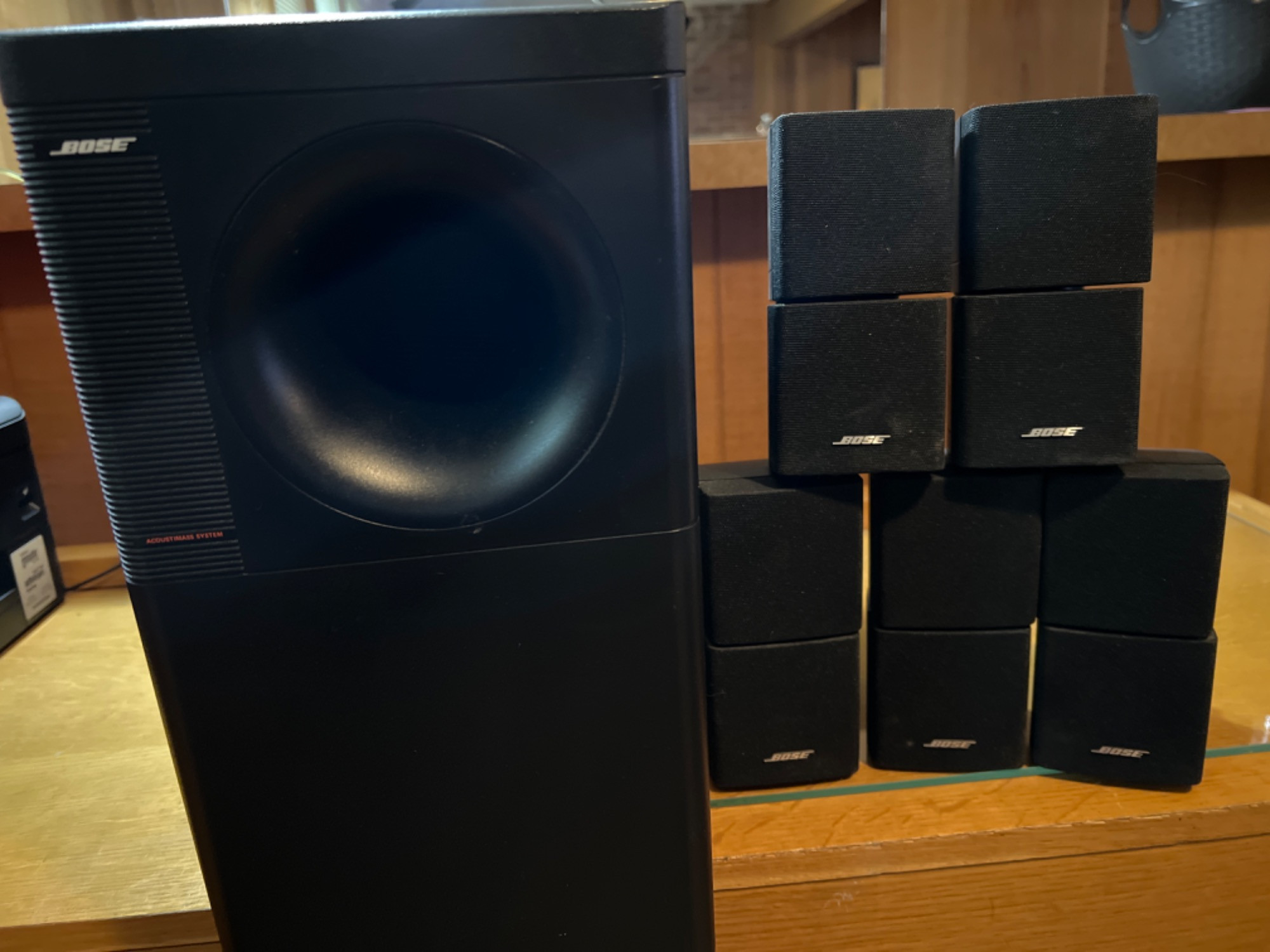 Subwoofer and 5 speakers. Serial number: 021364901820449AC, Bose. 1998. speaker size: 6.5” tall x 4” x4”