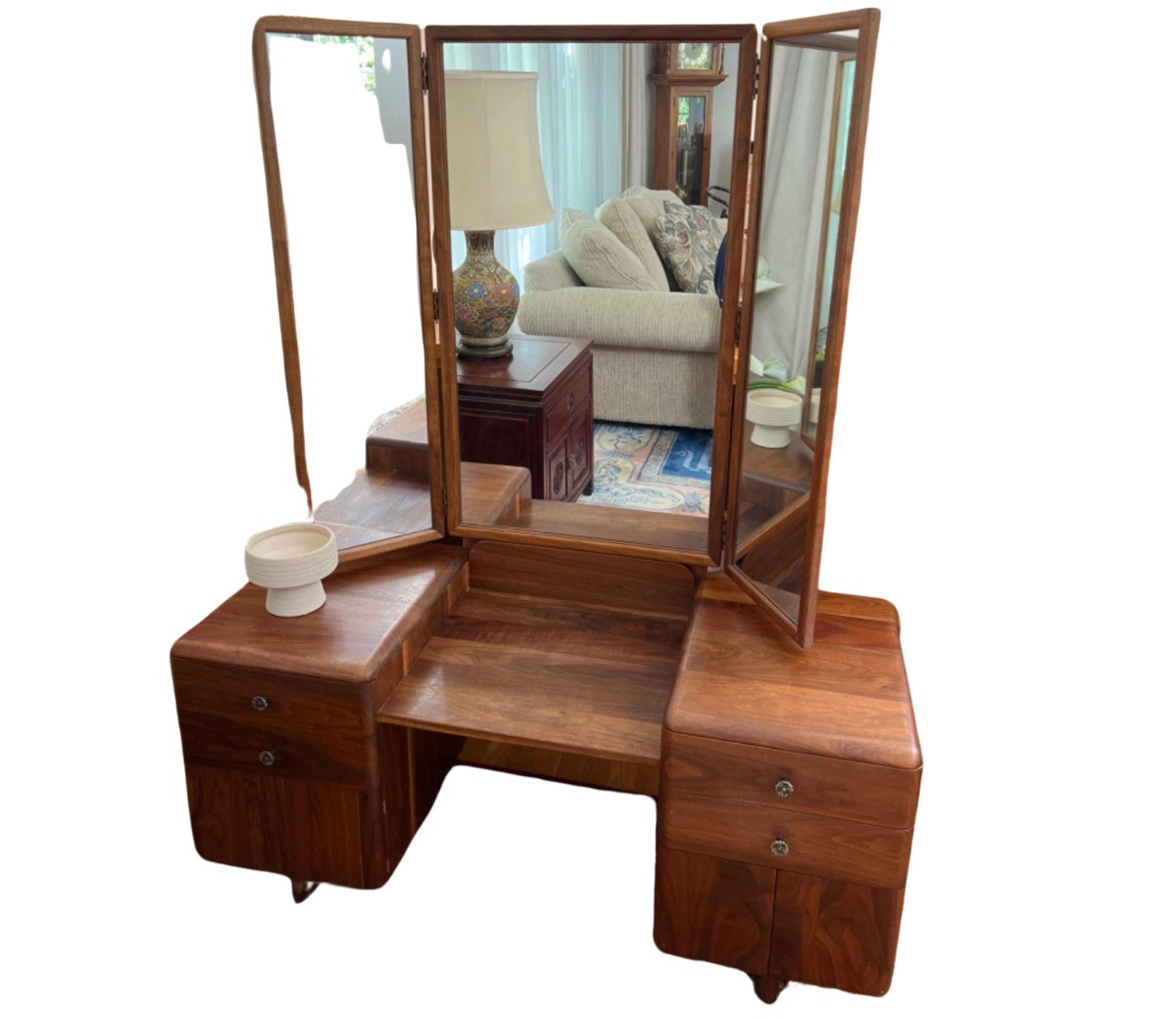 Dresser is Japanese style on ground/pillow seating for makeup application and dress preparation. This item is handcrafted from solid wood. The finish is smooth and the entire piece is nearly flawless for a vintage piece of furniture. Vanity piece is 47" wide x 18" deep x 21" tall. It has two drawers and a cabinet with doors on each side. The mirror attaches at the back, and it folds into itself to hide the mirror when not in use. The left side hinges are looser than they should be and may need to be tightened or replaced. Mirror is 37" tall and 42" wide. Bidding on this lot is an agreement that: (1.) You