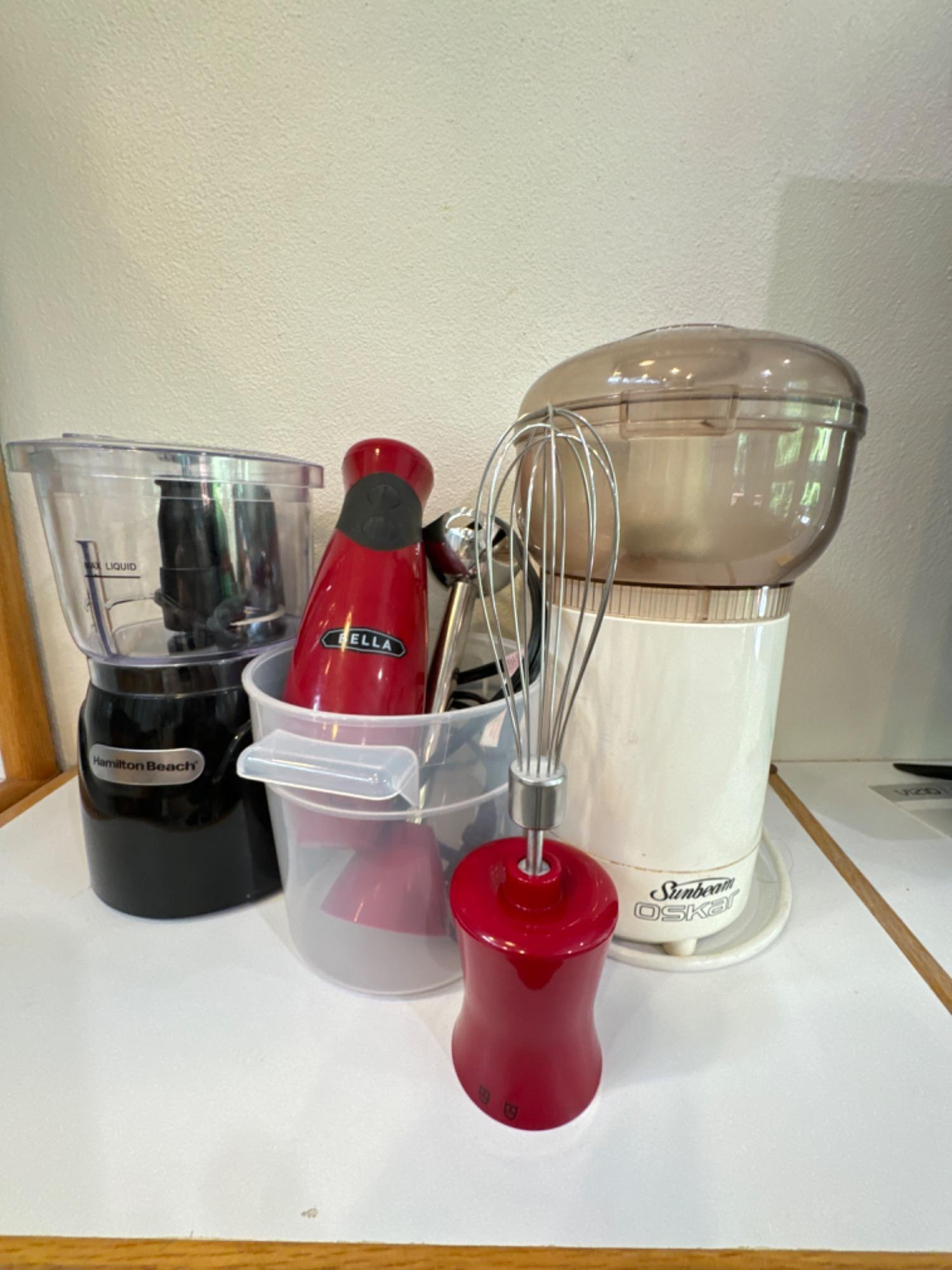 Sunbeam Mini Food Processor 10” H Hamilton Beach Mini Food Processor 8.25” H Bella Hand Immersion Blender with attachments.