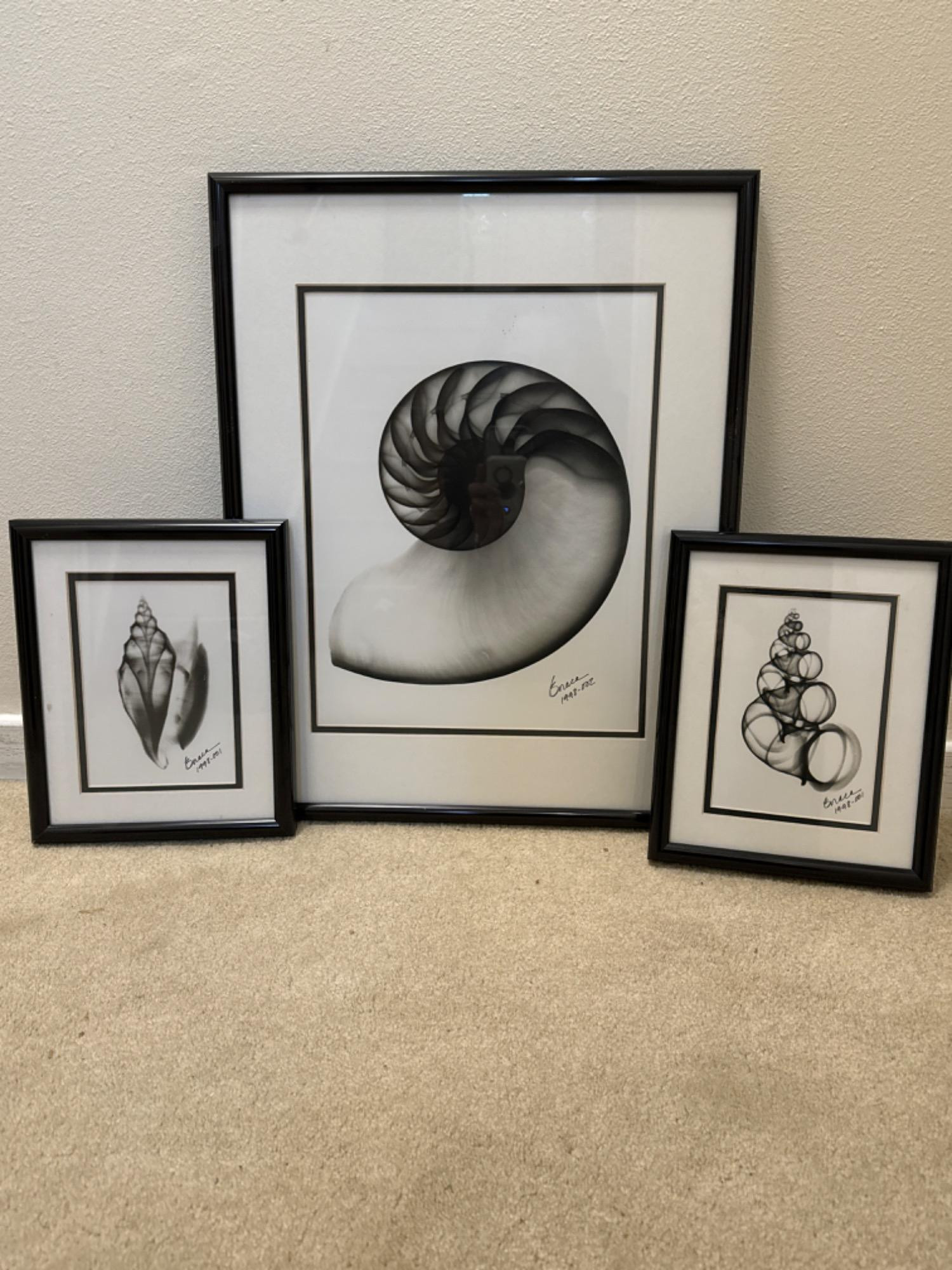 B & W x-ray prints of shells by Boraca, set of 3. Chambered Nautilus frame measures 20” H x 16” W.