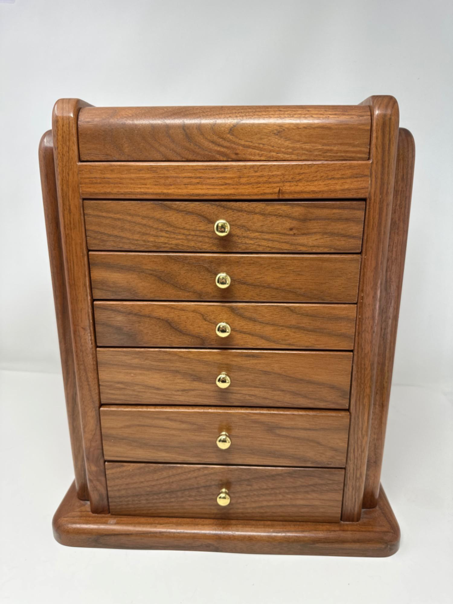 This jewelry box for a table top measures 14.25 inches tall x 11 inches wide x approximately 8 inches deep. Felt lined drawers, and wonderful craftsmanship