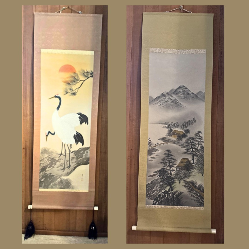 Japanese’s Scrolls on textured art paper of Cranes and a village. Set of 2 ball weights made of stone for bottom of 1 scroll. Measures 20” W x 5 feet long. Original storage boxes included.