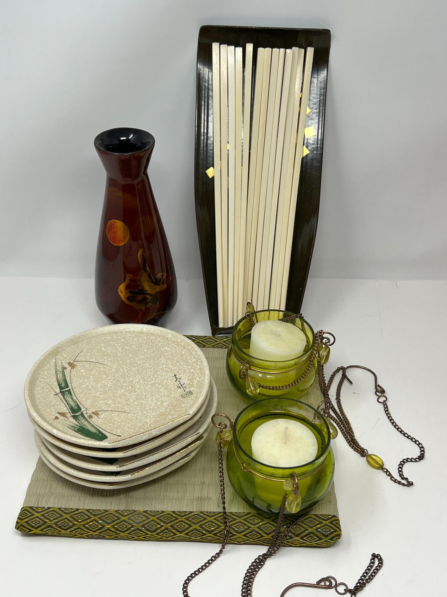 Vintage lacquered vase with birds of paradise, bakelite chopsticks (5 pair), ceramic sushi plates and two hanging votives. Plates are 4-5 inches and vase is appoximately 6" tall.