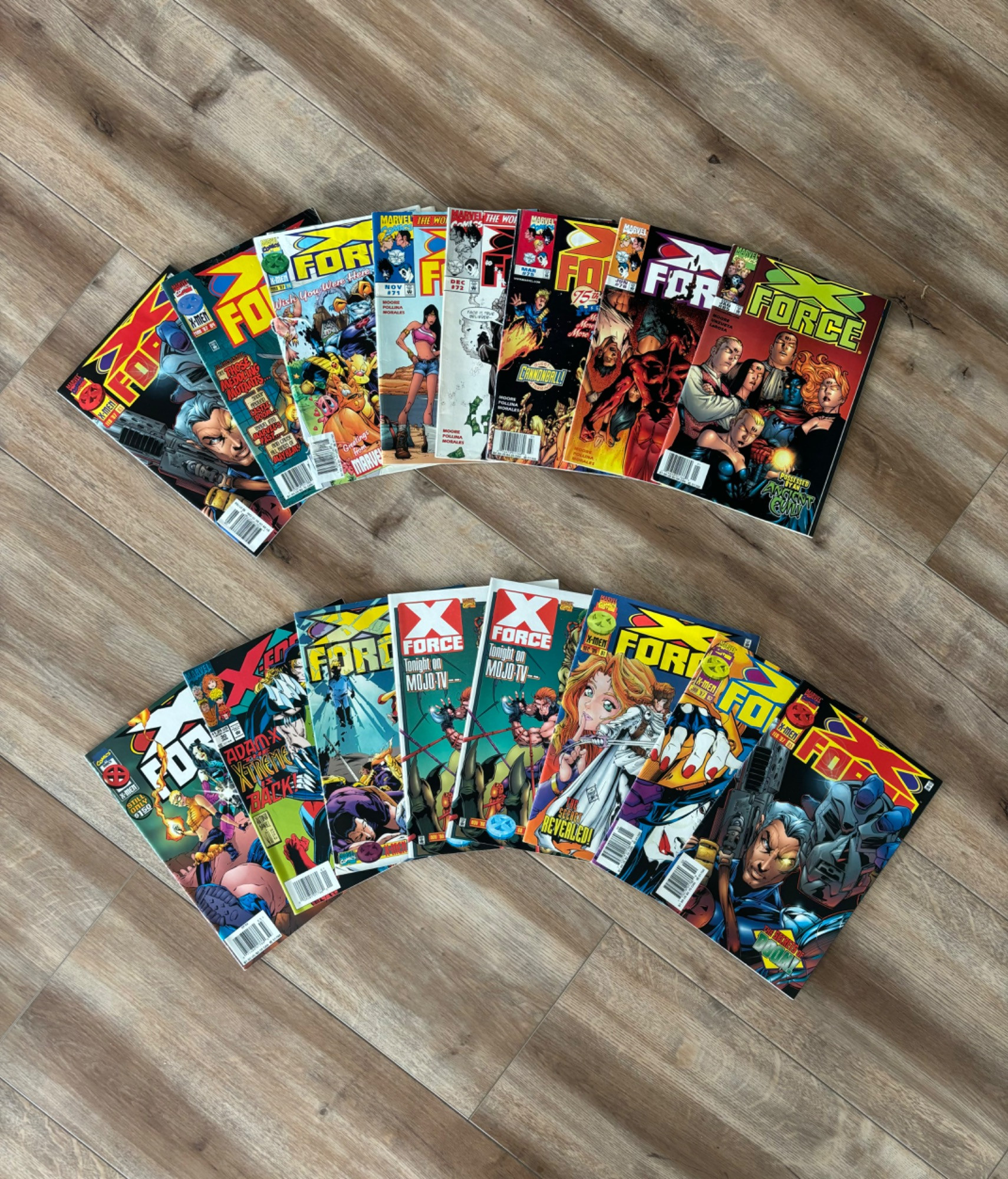 A collection of various issues of the X Force series. Conditions vary, but they are all good for reading with excellent coloring! X Force issue 66, front cover torn off