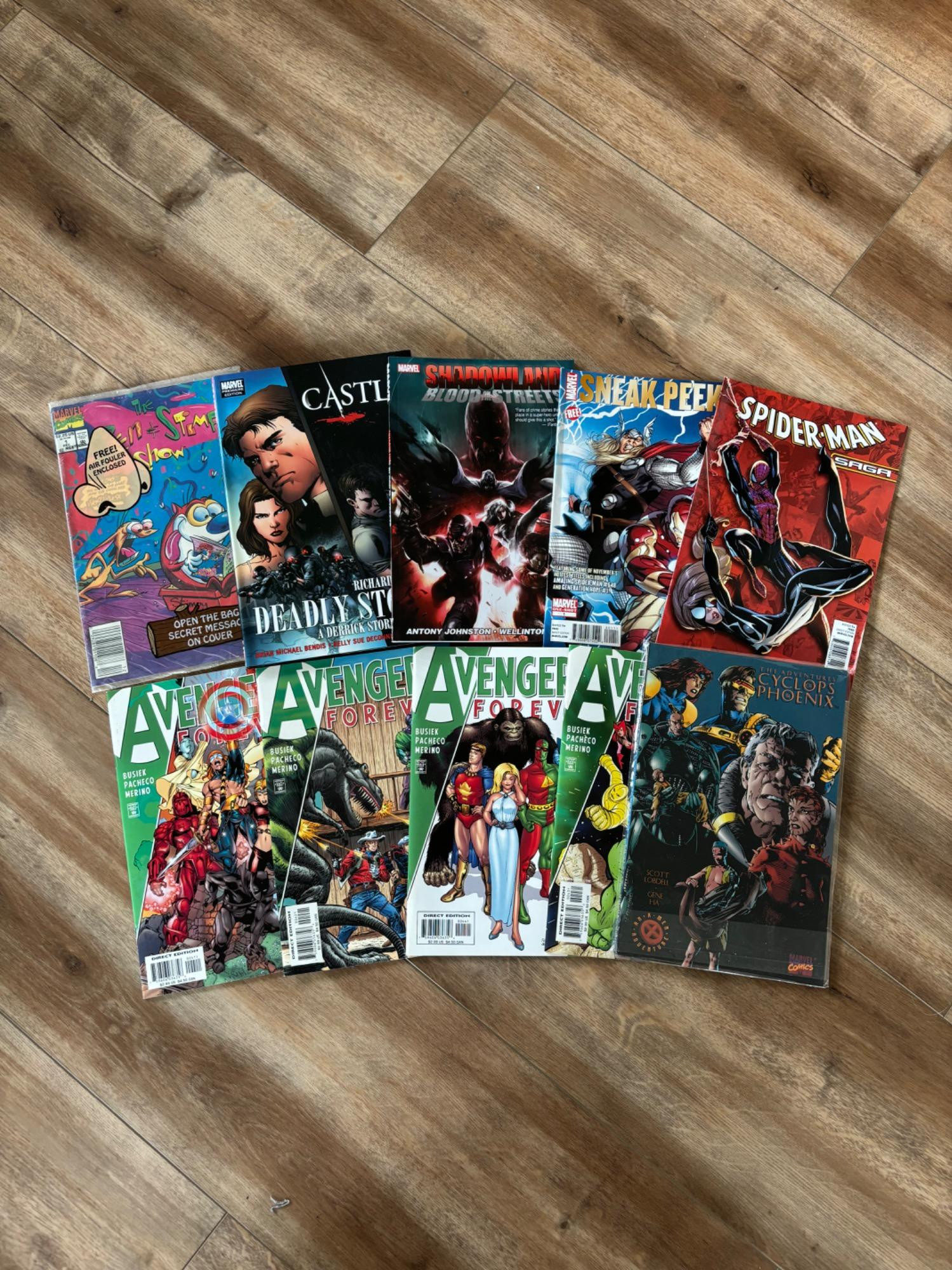 A collection of various issues of Marvel characters like Spiderman, Cyclops & Phoenix, and more! Conditions vary, but they are all good for reading with excellent coloring!