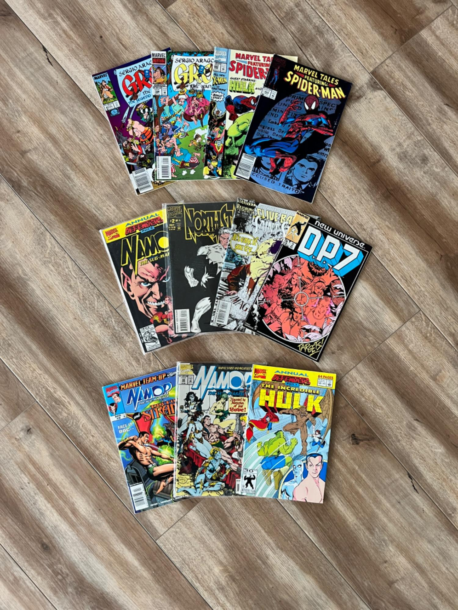 A variety of Marvel comics featuring iconic characters like Spider-Man, Namor, and the Hulk! Conditions vary, but they are all good for reading with excellent coloring!