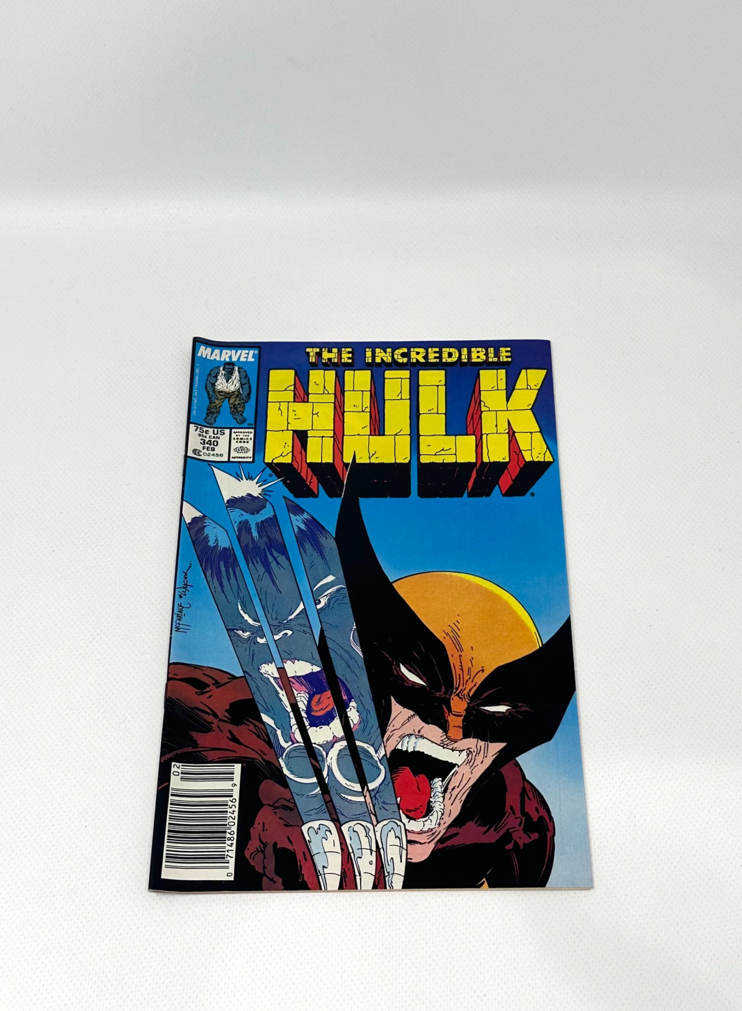 Listed is Marvel's The Incredible Hulk #340 Mark Jewelers Insert! This issue is one of the most popular comic book covers of ALL TIME!!! Not only is this one of the most respected art works in comic book history, but the actual comic in hand includes the very rare Mark Jewelers Insert. The Mark Jewelers Insert is in approximately 5% of each printed issue, making this specific copy very rare! Condition: Each flaw is captured and is included in the photos. It has a series of tiny tick marks running along the spine, and the spine has a "stacking curl." It also has a tiny dent right above Wolverine's head. Despite that the book has very bold and bright colors, and is very much presentable. It is roughly in FN - FN+ condition.