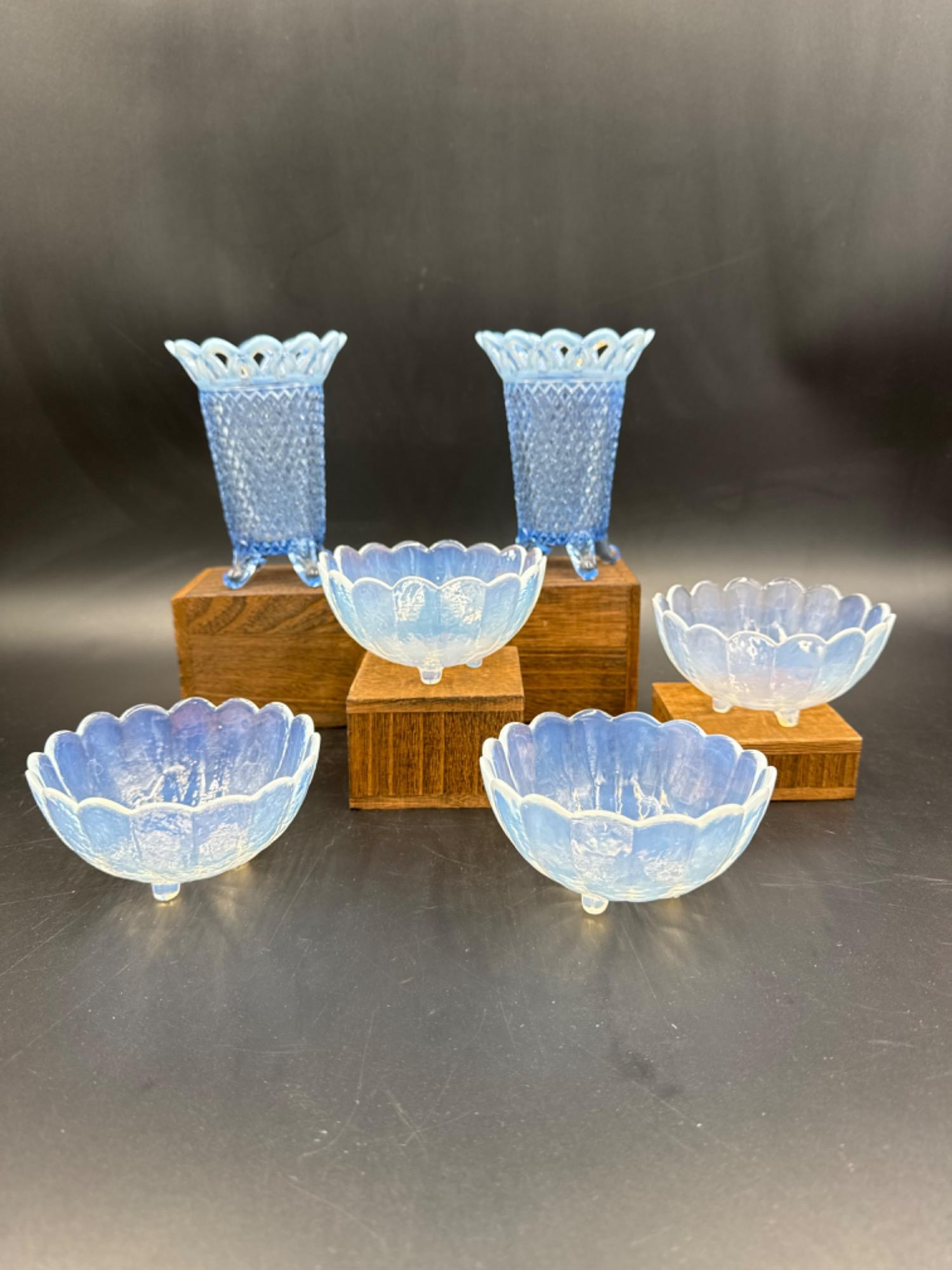 Imperial Glass Opalescent Lace Katy Blue Diamond Point Footed Vase Pair - 5.25"T x 4"D at widest (4) Opalescent Elegant Glass Scalloped Berry Finger Bowls - 4.25"D All are in exceptional condition!