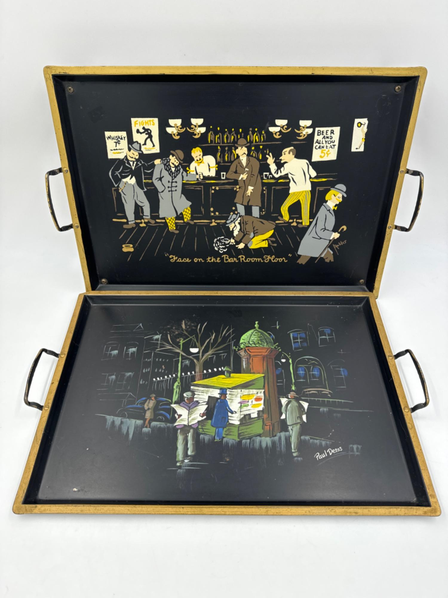 Nashco Hand Painted Serving Trays - Music Box Robles & Paul Denis Both measure: 17.25”L handle to handle x 11.25”W Robles 3”T at handles - Has music box that plays 'How Dry I Am' Denis has rust spot towards top