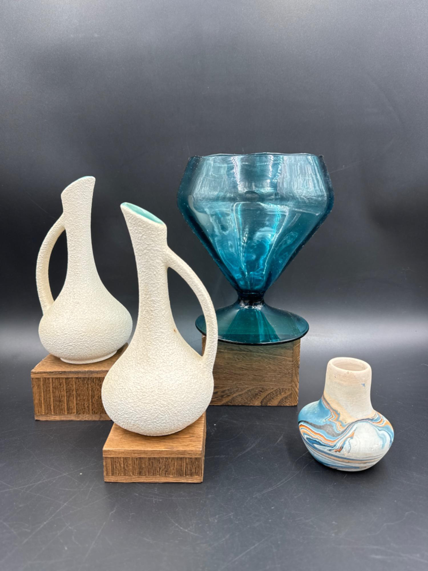 Royal Haeger Cotton White & Turquoise Ewers - 7.5”T - flea bite on lip of 1 - needs cleaning Nemadji art pottery vase - 3.5”T REPAIRED Italian Blue Glass Vase - 7.25”T - repair is done well, was not noticeable until put in the light box for photos