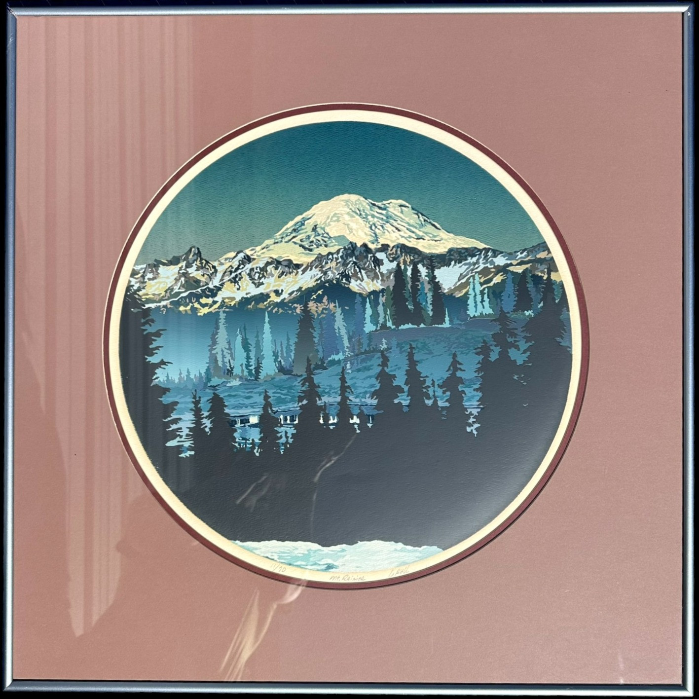 Signed and Numbered 'Mt. Rainier' Serigraph Art Piece by Gregg Johnson - 11/70 Text on back reads: "Limited edition serigraph by Gregg Johnson (Washington 1943-2007) titled, "Mt. Rainier." The piece is numbered 11/70, titled and signed lower left, center and right respectively. The circular double mat opening has a diameter of 16.5" and the square metal frame is 24.25" x 24.25". The piece is not dated but believed to have been created in the 1970s.