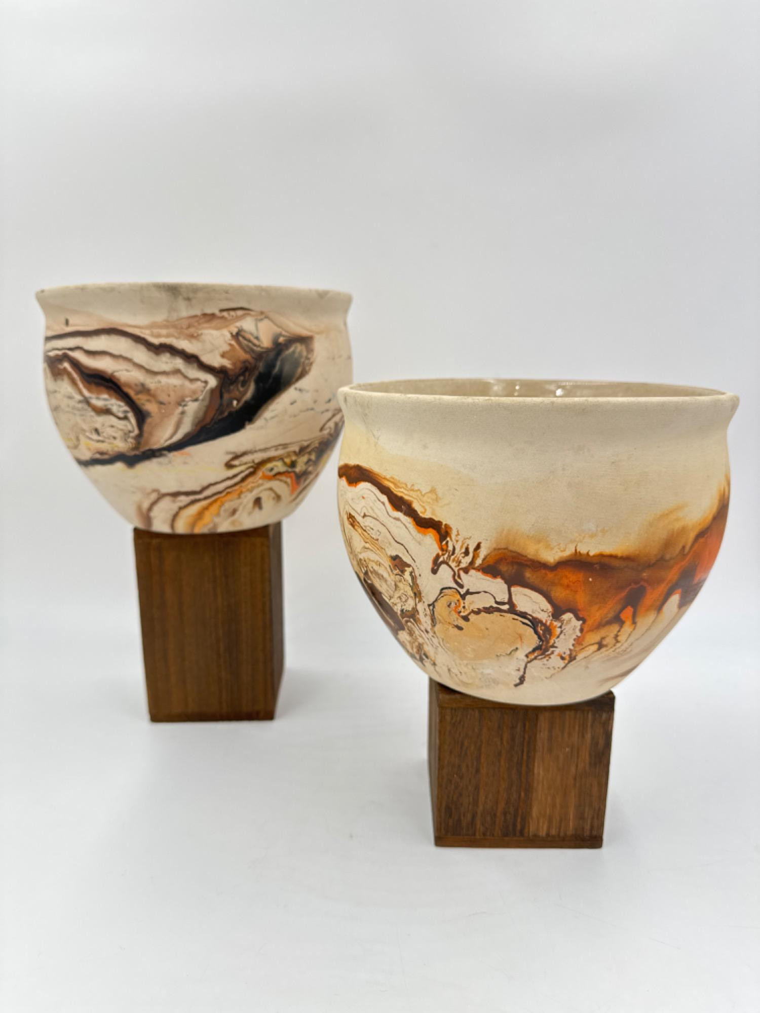 Vintage Nemadji Pottery Swirl Vessel Planters 7”D x 5.25”T - great condition 7”D x 5.5”T - has scuffs and discoloration, used as planter Free of nicks, chips, and cracks