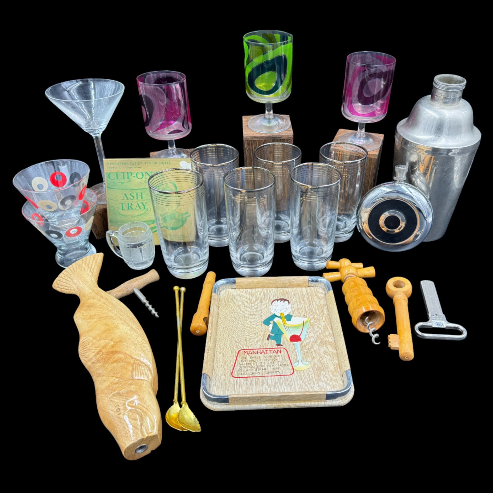 Carved fish tap handle, Wood cocktail serving tray, Variety of corkscrews, Super fun cup and flask duo, (3) Mod Psychedelic Leonardo stemware 5.25"T All items shown are included Wear to the olive martini glasses