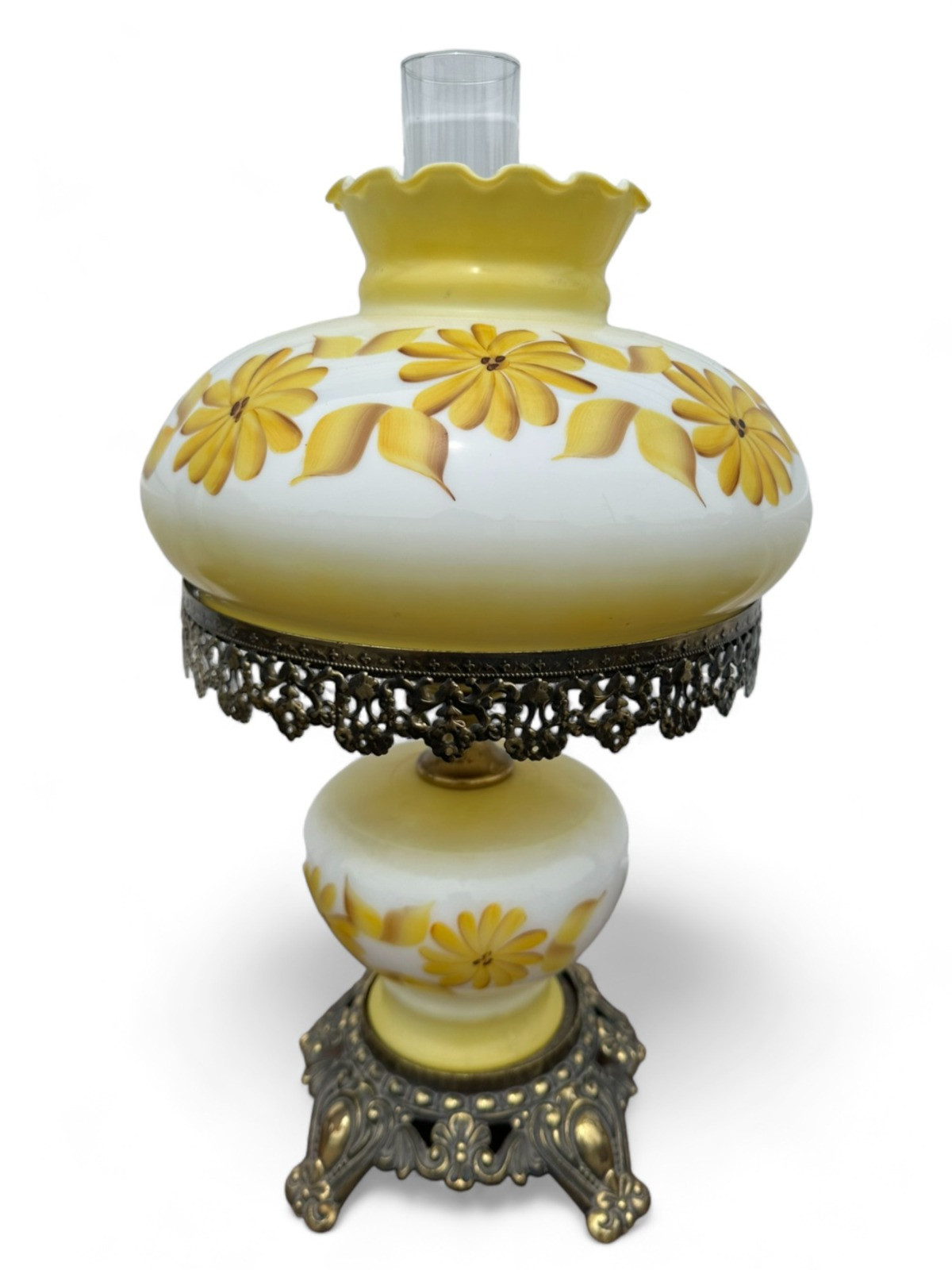 Vintage Hand Painted Yellow Daisy GWTW Electrified Oil Lamp Beautifully hand-painted, yellow floral design. Aged brass tone metal base. In EXCELLENT condition Untested Measures: 20” tall