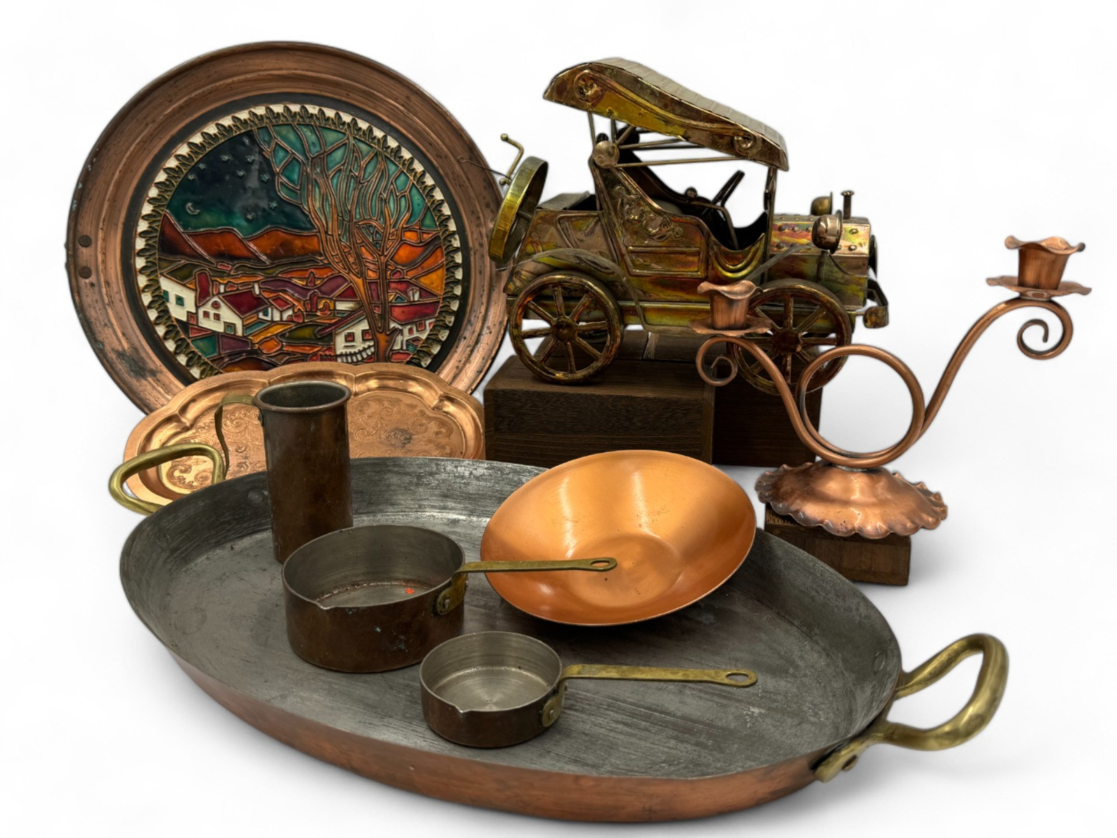Made in Italy hammered copper and brass pan -19" handle to handle x 16" x 11" cooking surface, Copper Antique working music box car, measuring cups, and more. Enamel copper plate - 12.5"D - handles are broken off