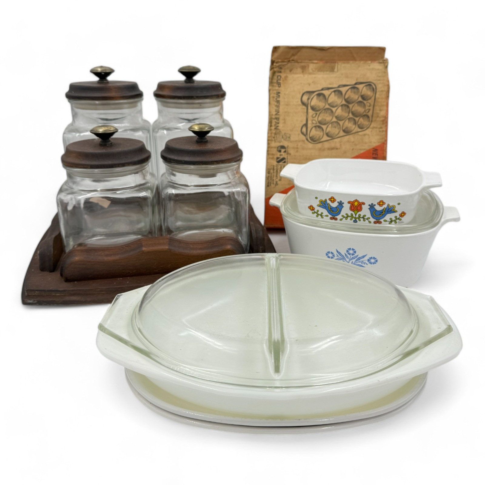 13.5 inch wood lazy Susan with 9.5" and 7" canisters - wear to wood, spins great Corning Ware Cornflower P – 2.5 – B casserole with lid Raised Corning P – 811 platters - some utensil marks Cast-iron 11 cup muffin pan PYREX 1.5qt Oval divided dish + 945 Clear lid (too small for dish)