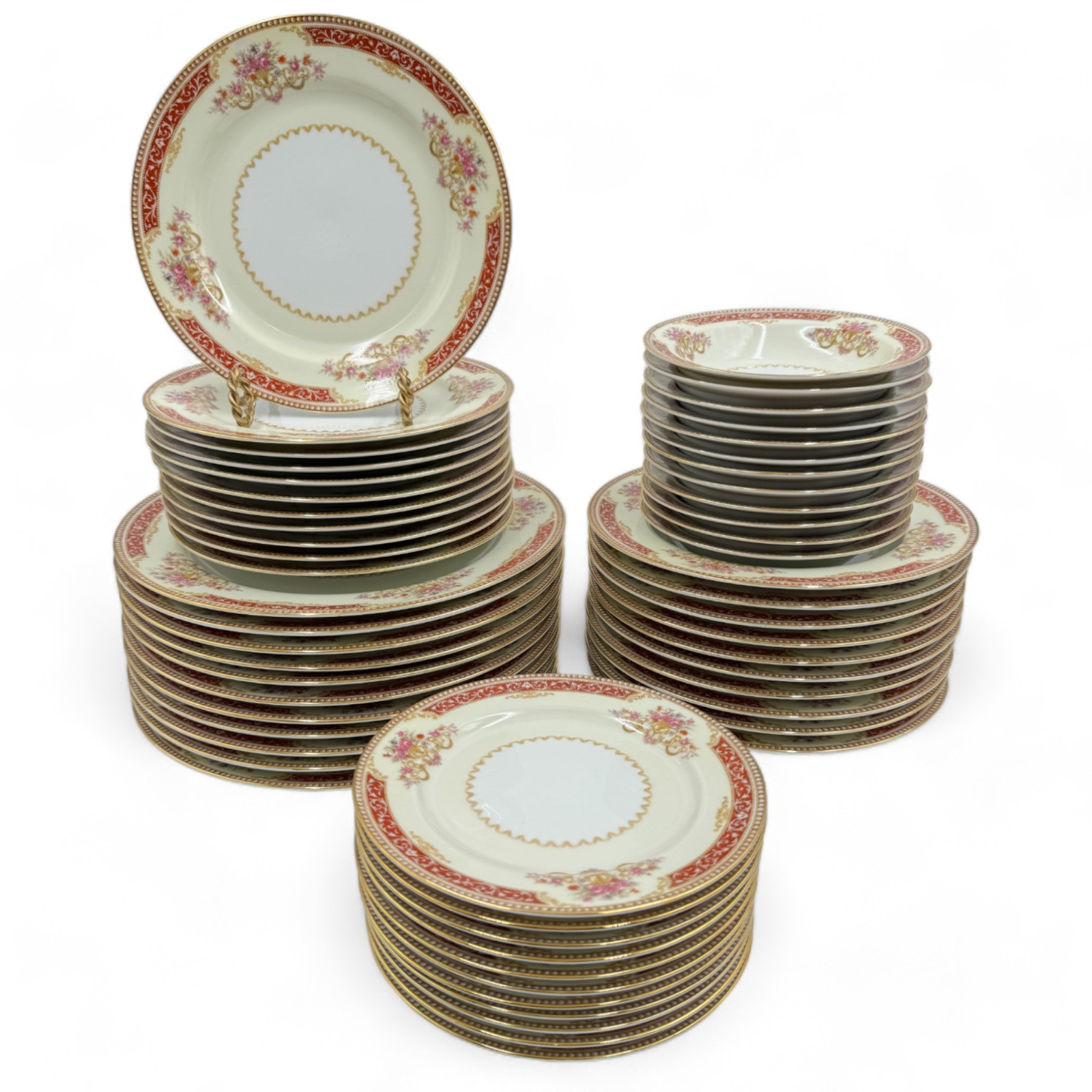 Occupied Japan Noritake Royal Ruby China Plates & Bowls (12) 6" bowls (10) 8.25" bowls (11) 6.5" plates (11) 7.5" plates (11) 10" plates Free of nicks, chips, or cracks One of the 8.25" bowls has a small spot