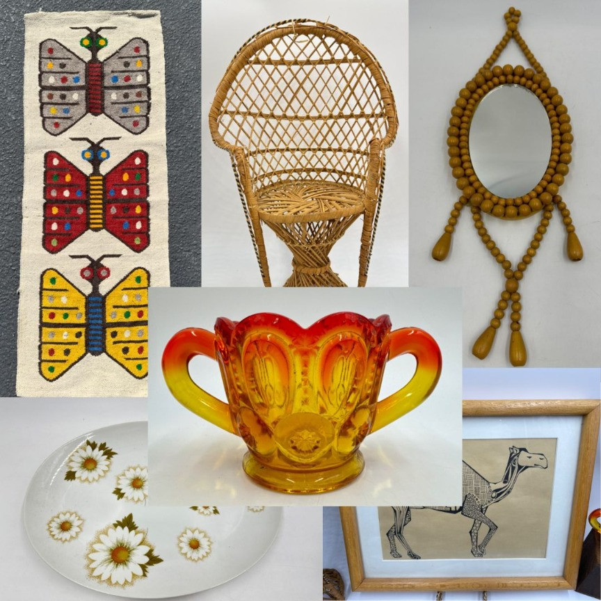 Geometri Camel - Frame measures: 5.25" x 12" 14 inch Mikasa Eclipse Boyne china platter 15 inch tall mini wicker seat MCM Woven butterfly tapestry 16" x 42" - heavy perfume scent L.E Smith Glass Amberina Sugar Bowl - excellent condition and more!