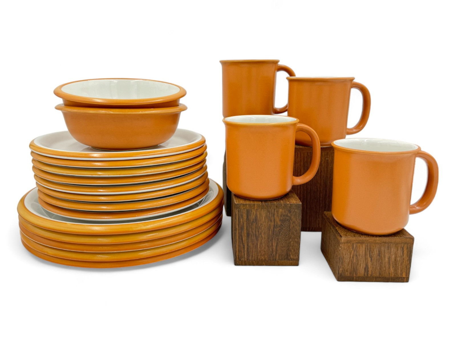 Vintage Crown Corning Japan Plates, Bowls, & Mugs - Terracotta & White (5) dinner plates 10.75"D (8) luncheon plates 9"D (2) bowls 6.75"D (4) Mugs Minor utensil marks on white surfaces - easily removed with Barkeepers friend or the like Free of nicks, chips, or cracks