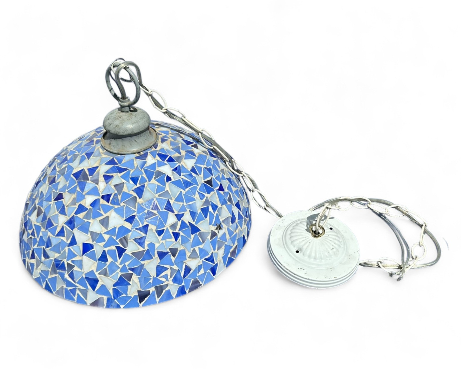 Vintage Blue Mosaic Tile & Glass Pendant Lamp Hardwire w/ ceiling flush mount The shade measures 14"D approx 6"T