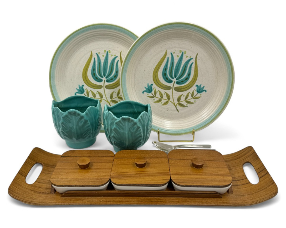 Lot # 119 - Mid Century Amthor Teak Serving Tray w/Dishes - Franciscan Tulip Time