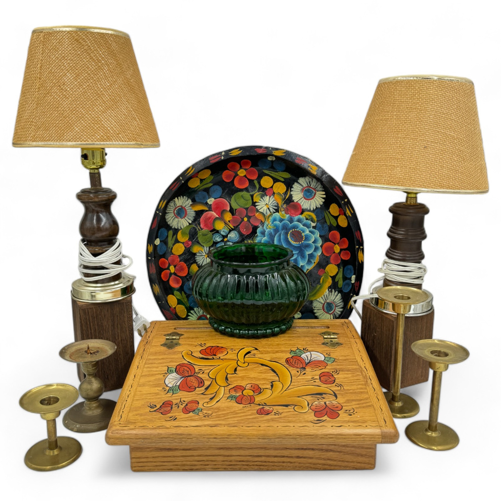 Rosemaled Handmade Oak Hinged Letter Box - Wald Works - 13.75 x 11.25”D Mexican Folk Art tray - 15.25"D ALR Co Forest Green Bowl 9.5” & 10” Turned wood lamps - both work Bulbs removed after photos, not included Vintage lamp shades in excellent condition Brass candle holders - (3) Toscany collection