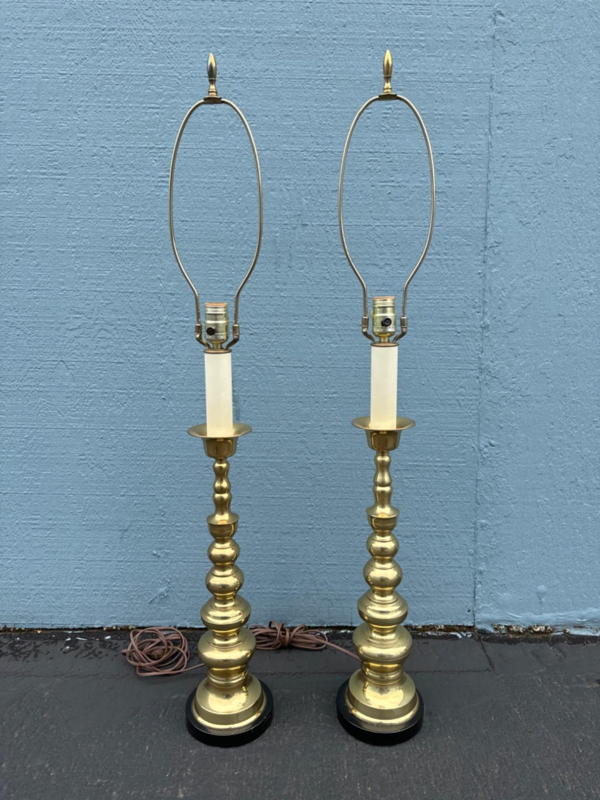 Vintage Brass Candlestick Tall Table Lamp Pair Measures: 39"T to finial Shifting of the brass base Has black metal base Both work