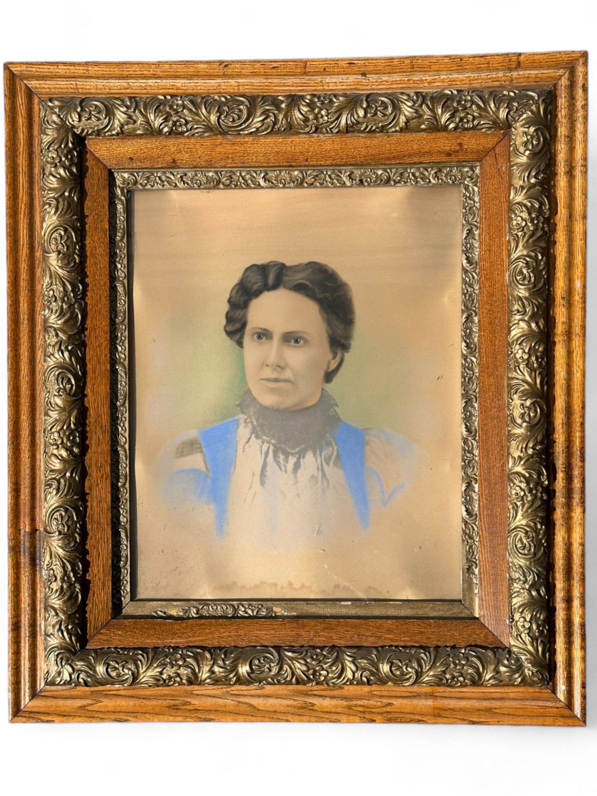 Antique Oak Framed Hand Tinted Portrait of a Victorian Woman Frame measures: 26.5" x 31" Detail has peeled from the lower center of the frame, silver paint peaks through the gold finish in some places Has water spot on bottom of portrait