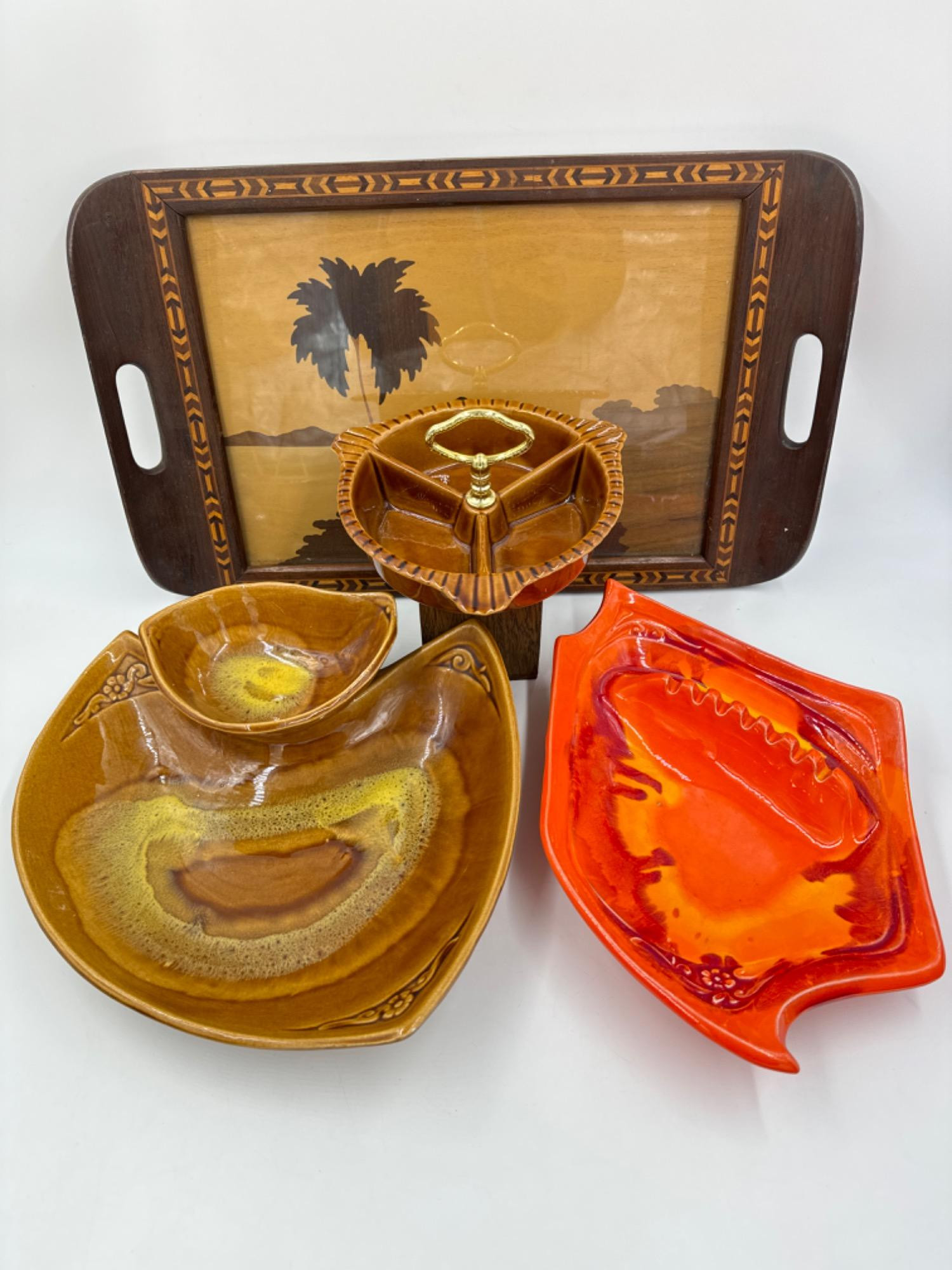 1960s Maurice of Calif Drip Glaze Ashtray & 2 Tier Serving Dish + DL717 ashtray approx 12.5"L - excellent condition Handle divided tray, CA Pottery L65 - 8"D Tray measures 19"L