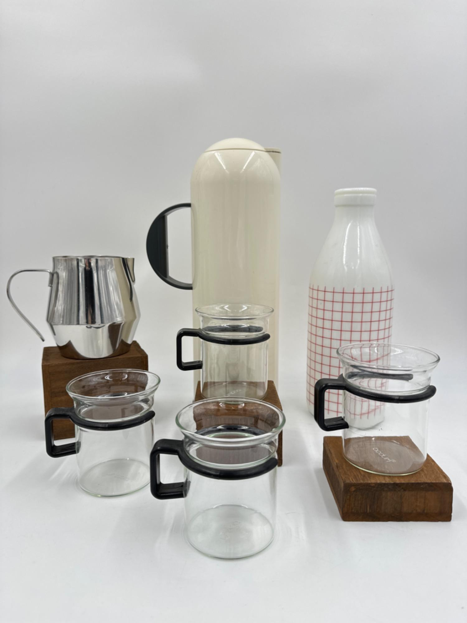 (4) Vintage Bodum Captain Picard Glass Tea or Coffee Cups w/ Plastic Handle - 3.25”T Vintage ROSTI Formula 1 Insulating Thermal Carafe - Memphis Design - Designed by Johan Weernink 12.25” - minor chips to spout lid, interior in good condition and more!