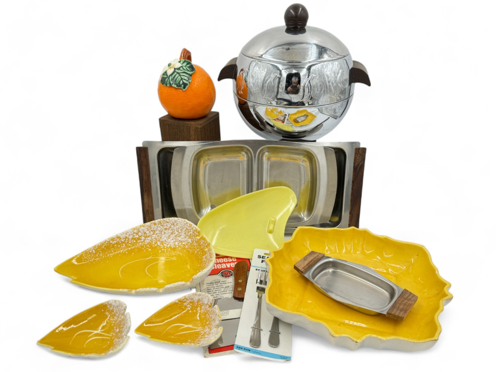 Mix of stainless trays - 6.5-15”L - Kalmar Tray 8.25”L Ceramic ashtray LA Potteries pottery bowl - 10” - has flea bite Melamine ashtray West Bend Penguin Hot and Cold Server - has flea bite sized surface imperfections