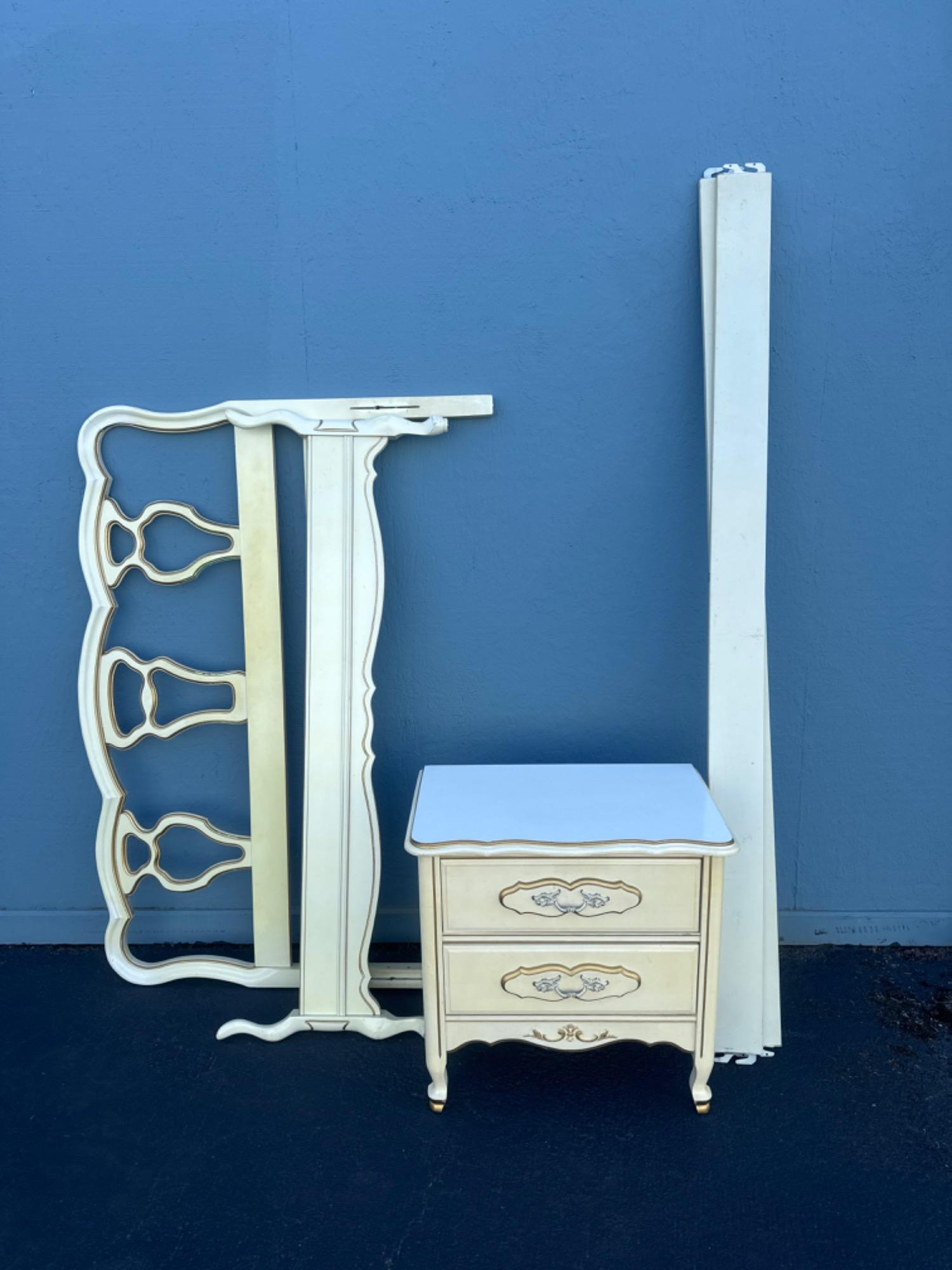 Vintage 1970s French Provincial Nightstand & Full Double Bed Frame Needs deep cleaning or paint job on exterior Nightstand measures: 24.25"W x 15.25"D x 24.25"T Headboard 56.5"L x approximately 39"T