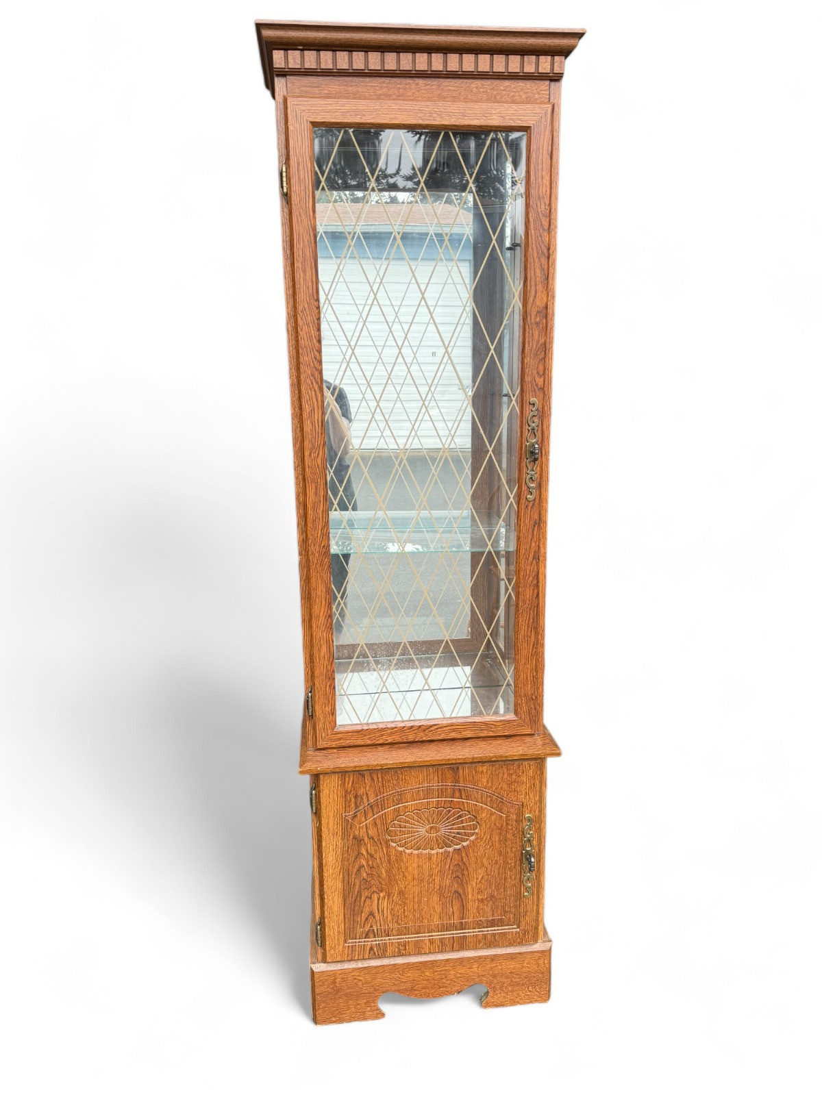 Retro Faux Wood Lighted Curio Cabinet w/ Glass Shelves Includes 4 glass shelves Measure 72"T x 12.5"D x 20.5"L Light is untested Watermark on the back. Tape damage to one side.
