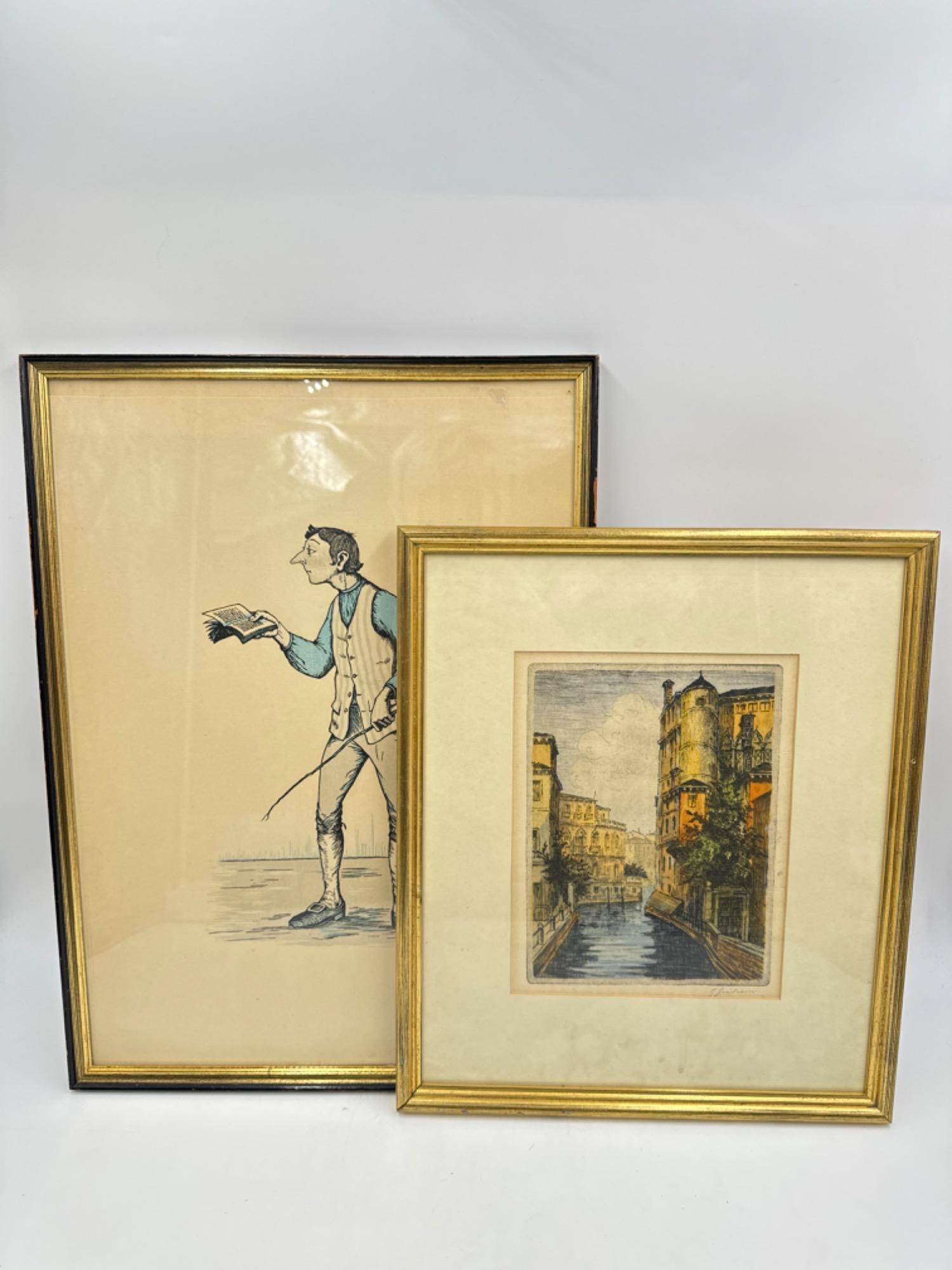 Signed Color engraving print of Venice and its' canal - still vibrant Frame measures: 15" x 12.75" Signed 1937 Philip Reed Woodcut & Pencil - frame has damage Frame measures: 18.75" x 13.5"