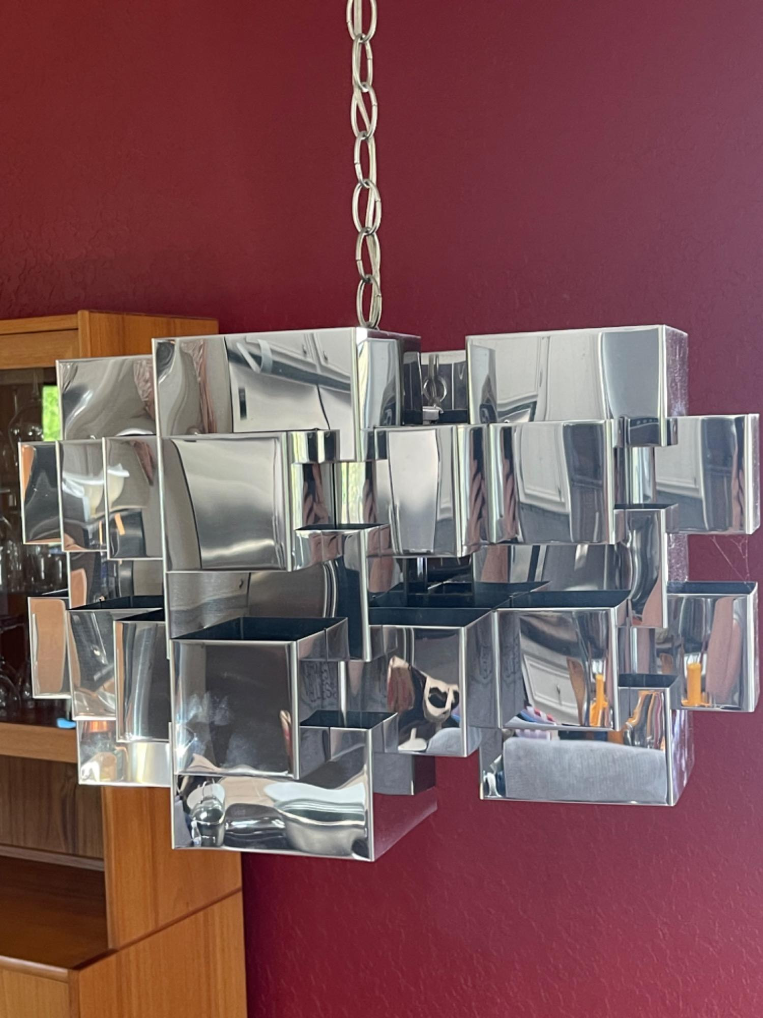 Vintage Signed Curtis Jere Cubist Chrome Chandelier - 21 W x 12T x 70" Chain Curtis Jere's cubist chrome chandelier. Nickel-plated chrome geometric cube shade by C. Jere, creator of some of the most striking and vivid items of their era, this dynamic sculptured ceiling light is in excellent condition. 4 bulbs You must bring ladder and equipment to remove chandelier. It is a vaulted ceiling.