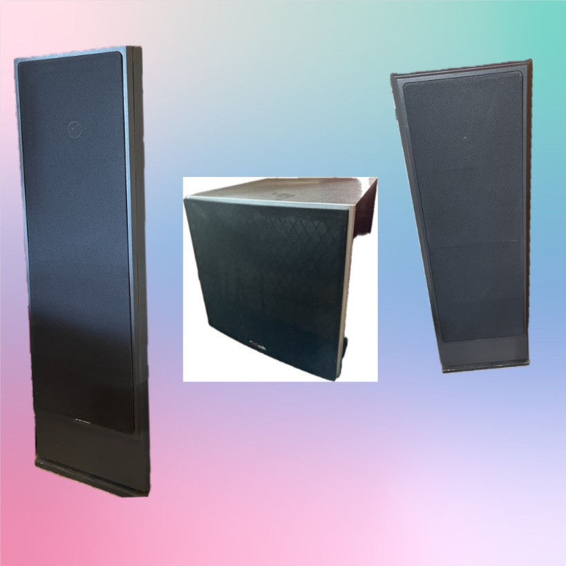 The LS70 incorporates two MW8100 Dynamic Balance 7.5" drivers in a progressive line source. When blended with an SL6000 Dynamic Balance 1" trilaminate dome tweeter, the LS70 accurately captures the vivid and emotional character of the original musical experience. Rosewood Formica Speakers-39" Tall x 12 x 15" Polk subwoofer-Add serious low-frequency impact to your movies and music with Polk's PSW10. This powered subwoofer delivers solid, accurate bass thanks to its 50-watt RMS amp and 10" woofer. The cabinet is constructed from non-resonant MDF, and is reinforced with internal bracings for superior bass clarity. The PSW10 is a great way to round out a home theater system or add depth to your stereo music.Polk makes it easy to integrate the PSW10 with your existing system. You can hook your receiver up to the sub either through the line-level or the speaker-level connections. And the continuously variable low-pass crossover lets you tailor the sound to match the PSW10 with the rest of your speakers. Speakers work great, cords included. No defects found, rubber in good shape. Rosewood Formica.